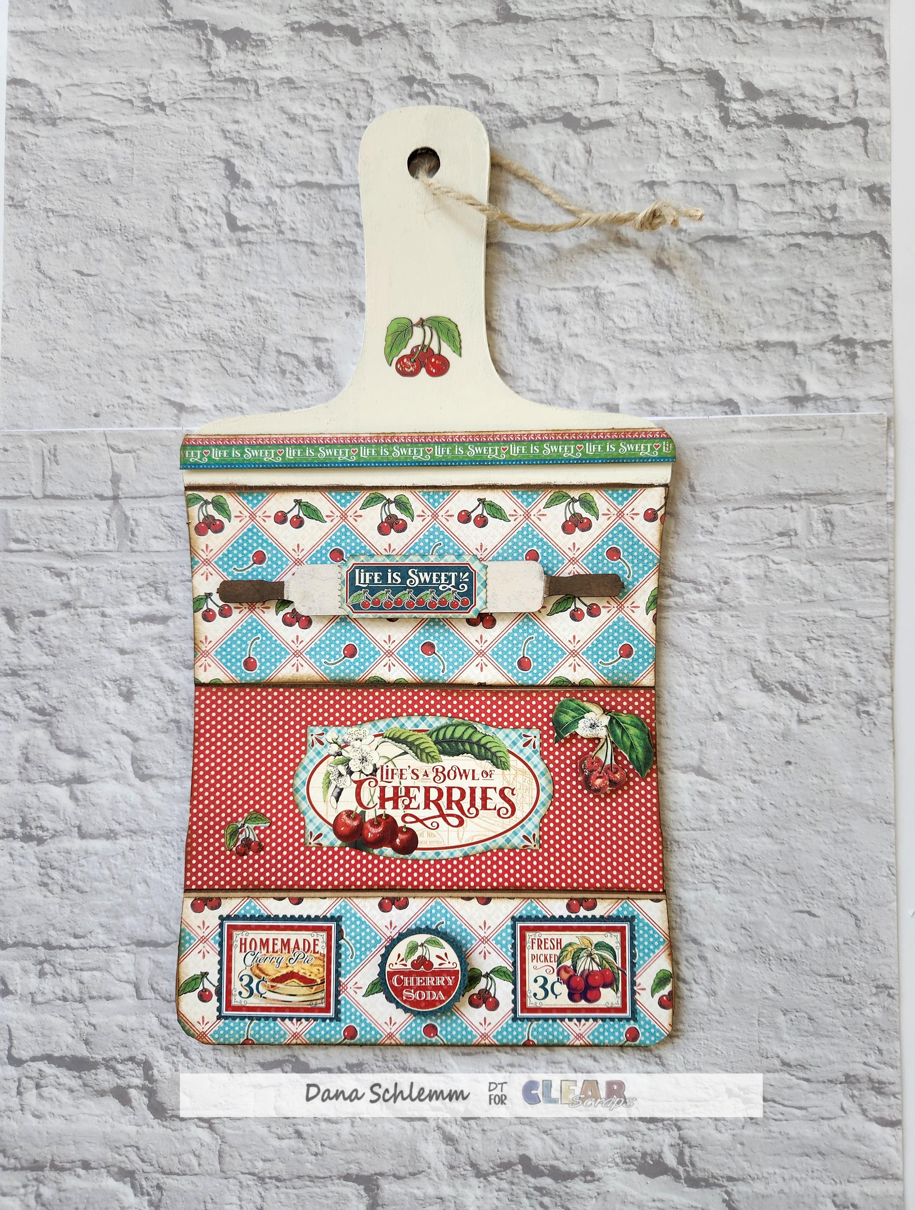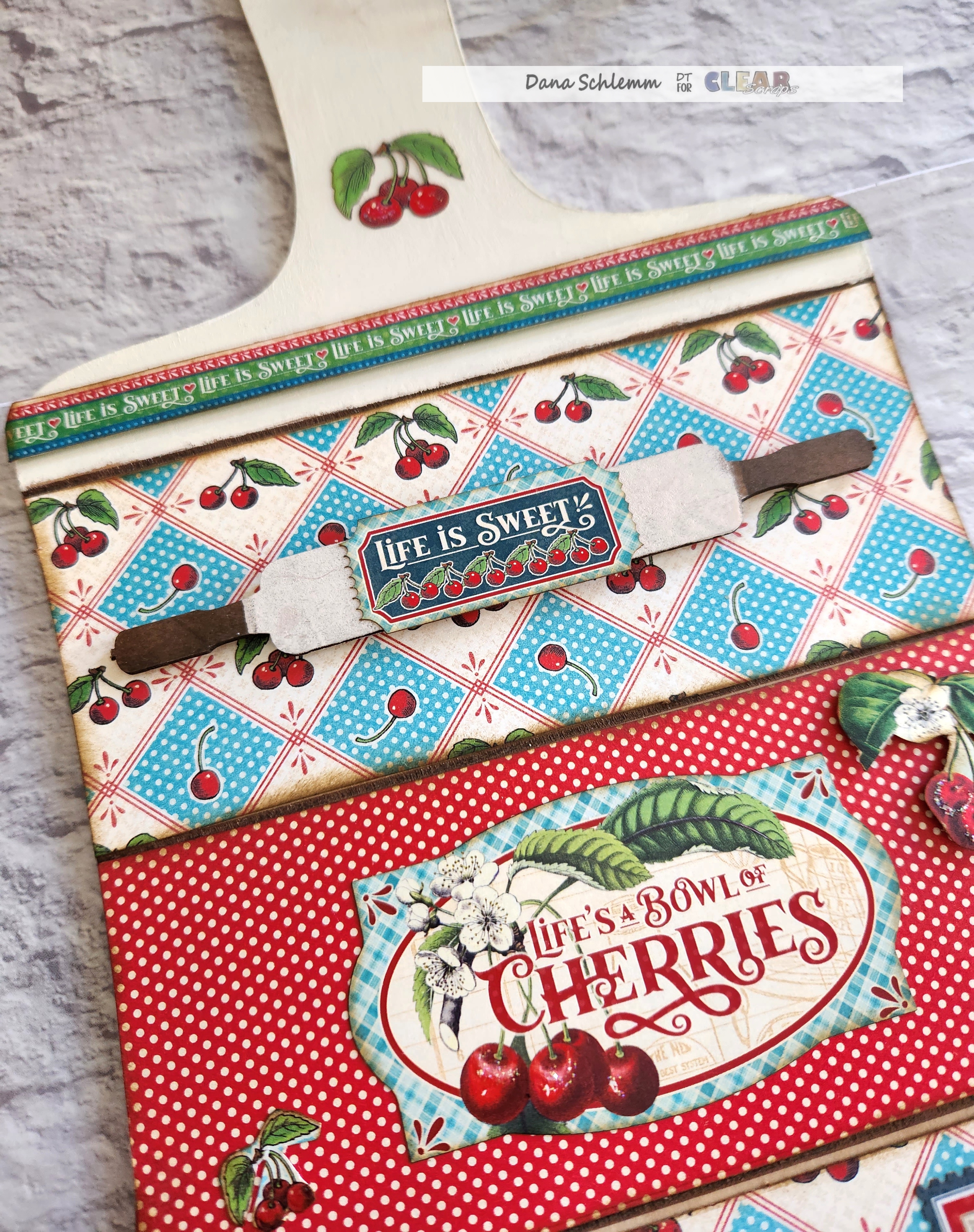 On the lower handle area on my cutting board, I glued this cute tiny cherry diecut. Below that, I cut out one of the Life is Sweet border pieces from the paper pad and adhered along the top edge using foam dots.