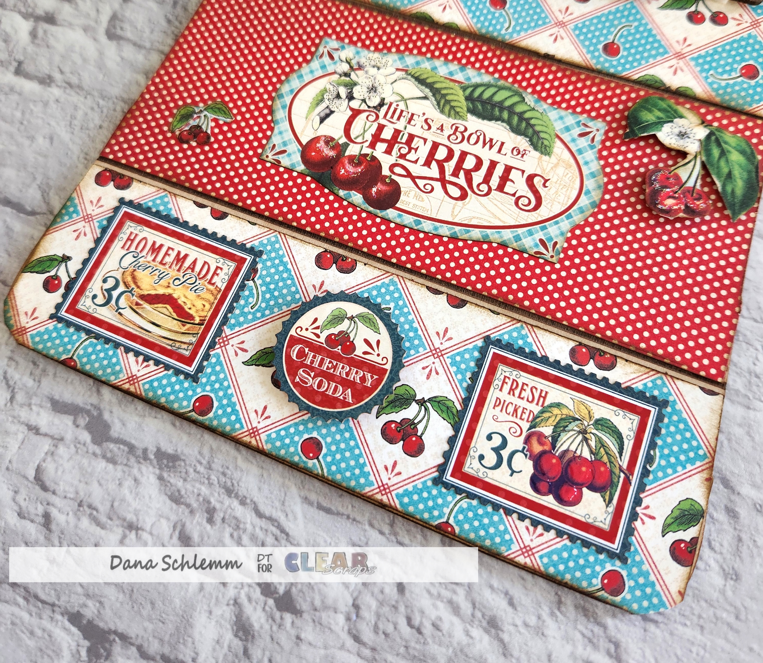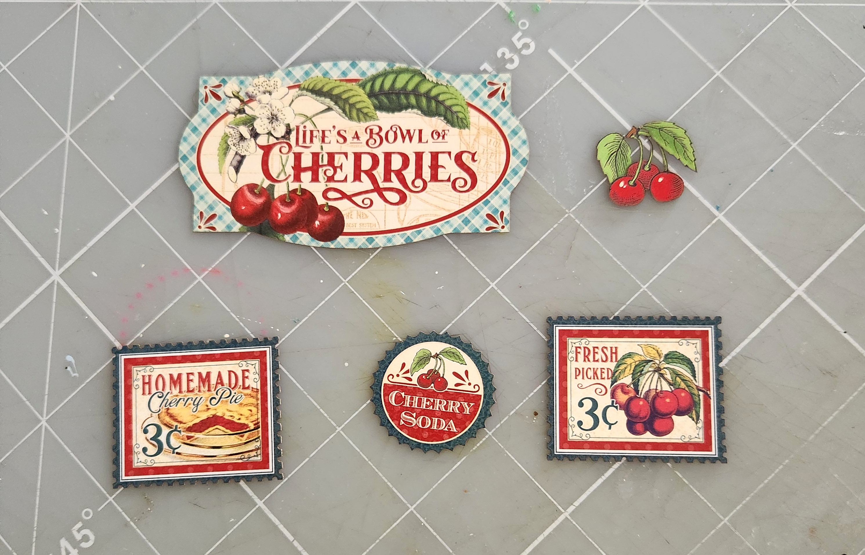 On the middle section on my cutting board, I glued a diecut sentiment in the center. Then fussycut acouple cherry embellishments and adhered in each corner.