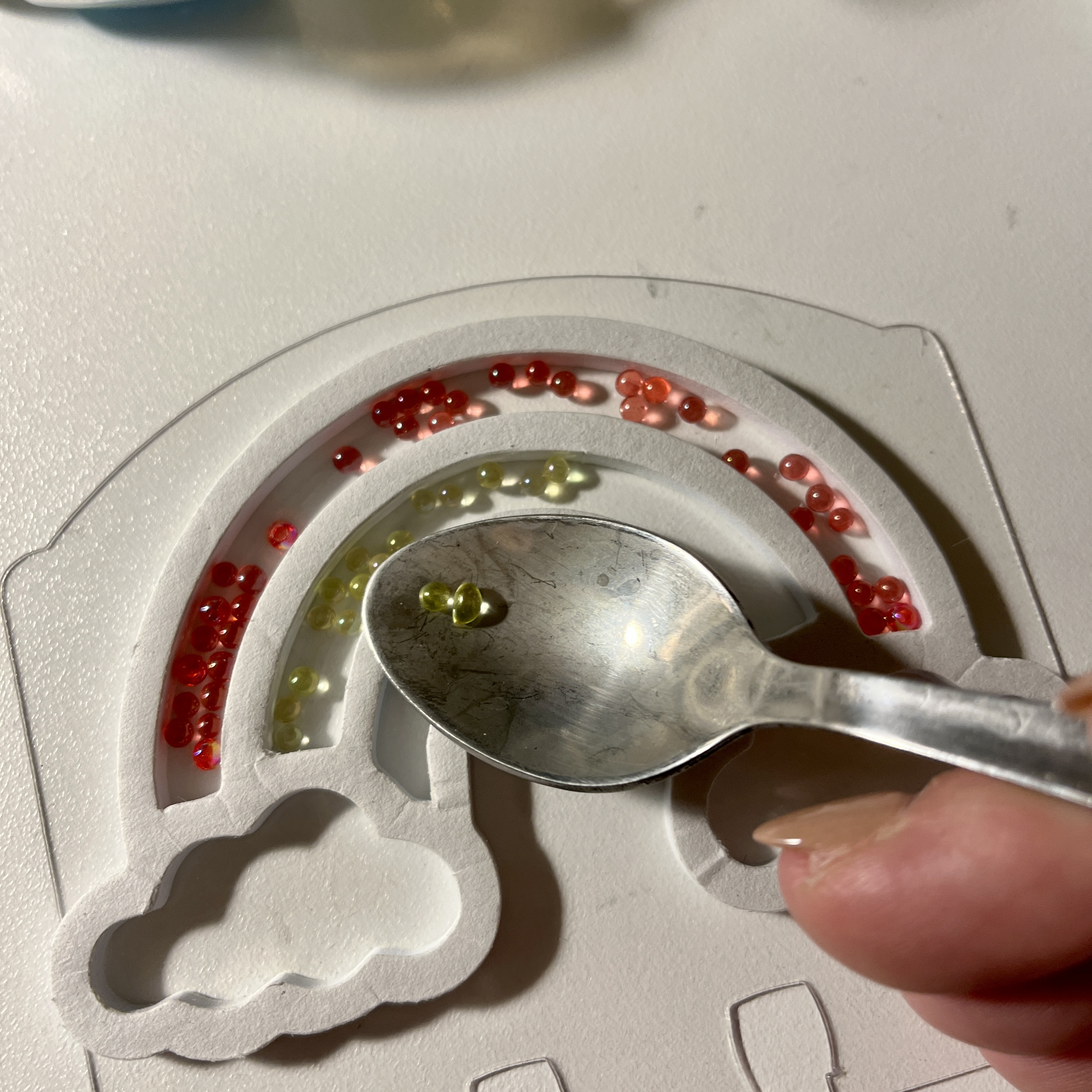 Next, I picked out one of the Rounded Acrylic Dividers to work with. I wanted this card to have some bling! The fun part of the acrylic cards are the ability to create a see-through project. I decided to add a shaker foam die cut from a set I have in my stash. This is a rainbow foam shape that I have filled with beads in assorted colors. Next, I add an acetate sheet over the top.