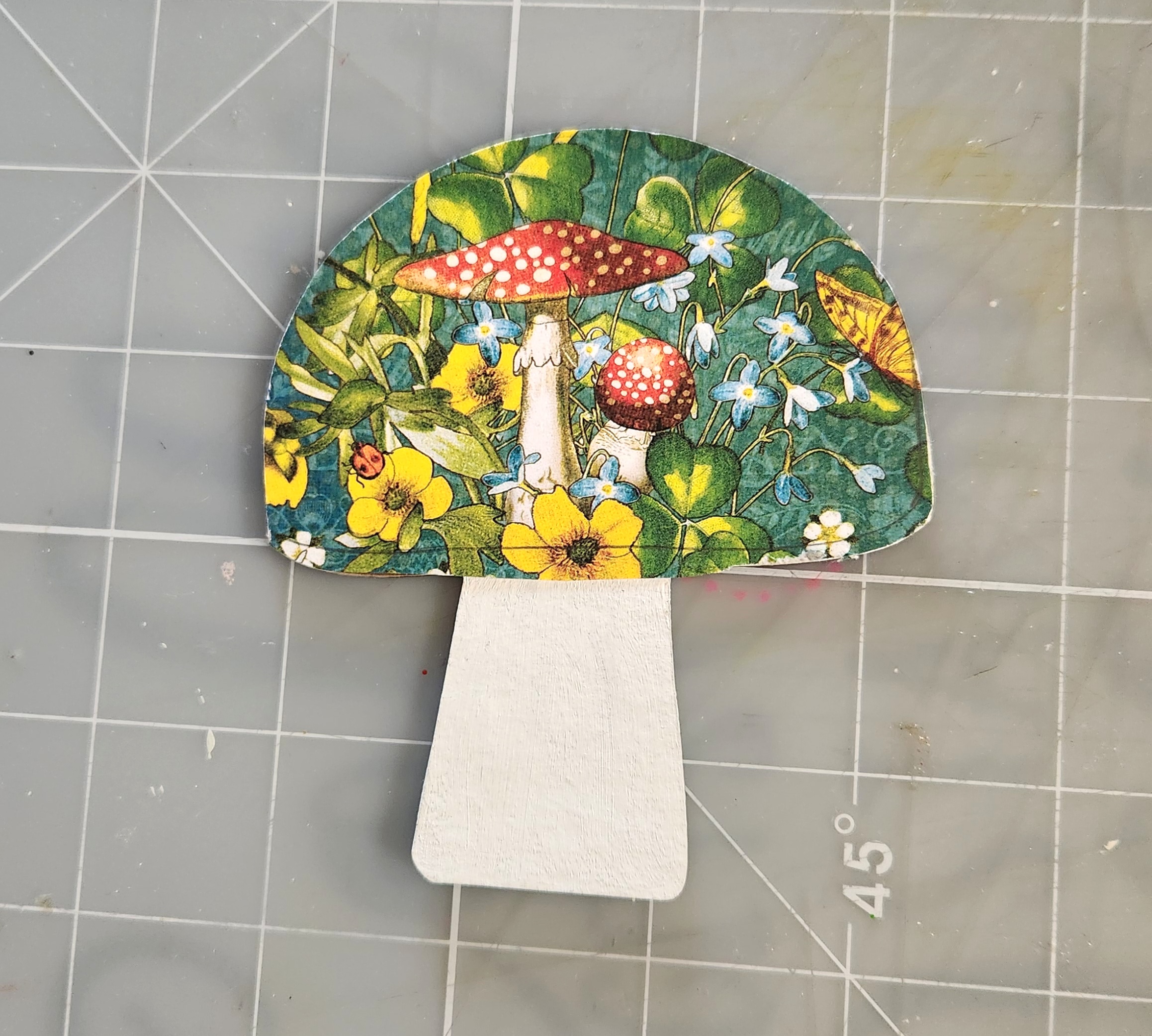 Taking the bottom mushroom cap shaker piece, I chose one of the patterned papers and traced around the mushroom cap. Cut out and glue your paper to your shaker base. Trim away any excess paper using an x-acto knife and smooth any rough edges using your sanding tool.