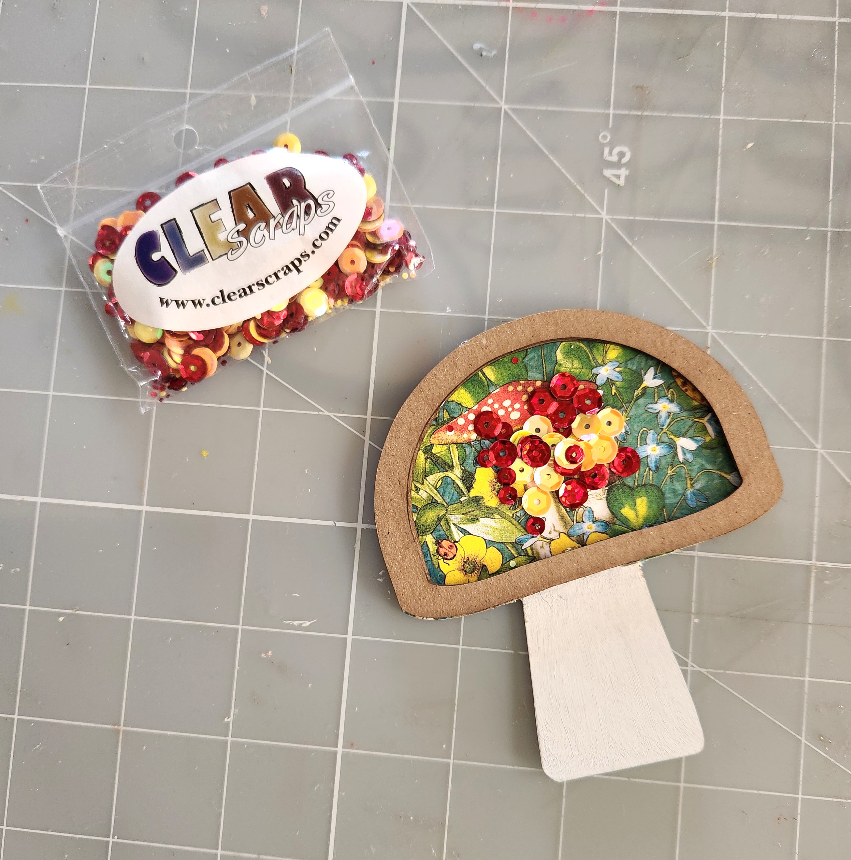 Take your next 2 bottom chipboard shaker pieces and glue in place on top of your bottom piece. Fill your shaker with glitter, beads, sequins (I used Clear Scraps Summer sequins) Click here
