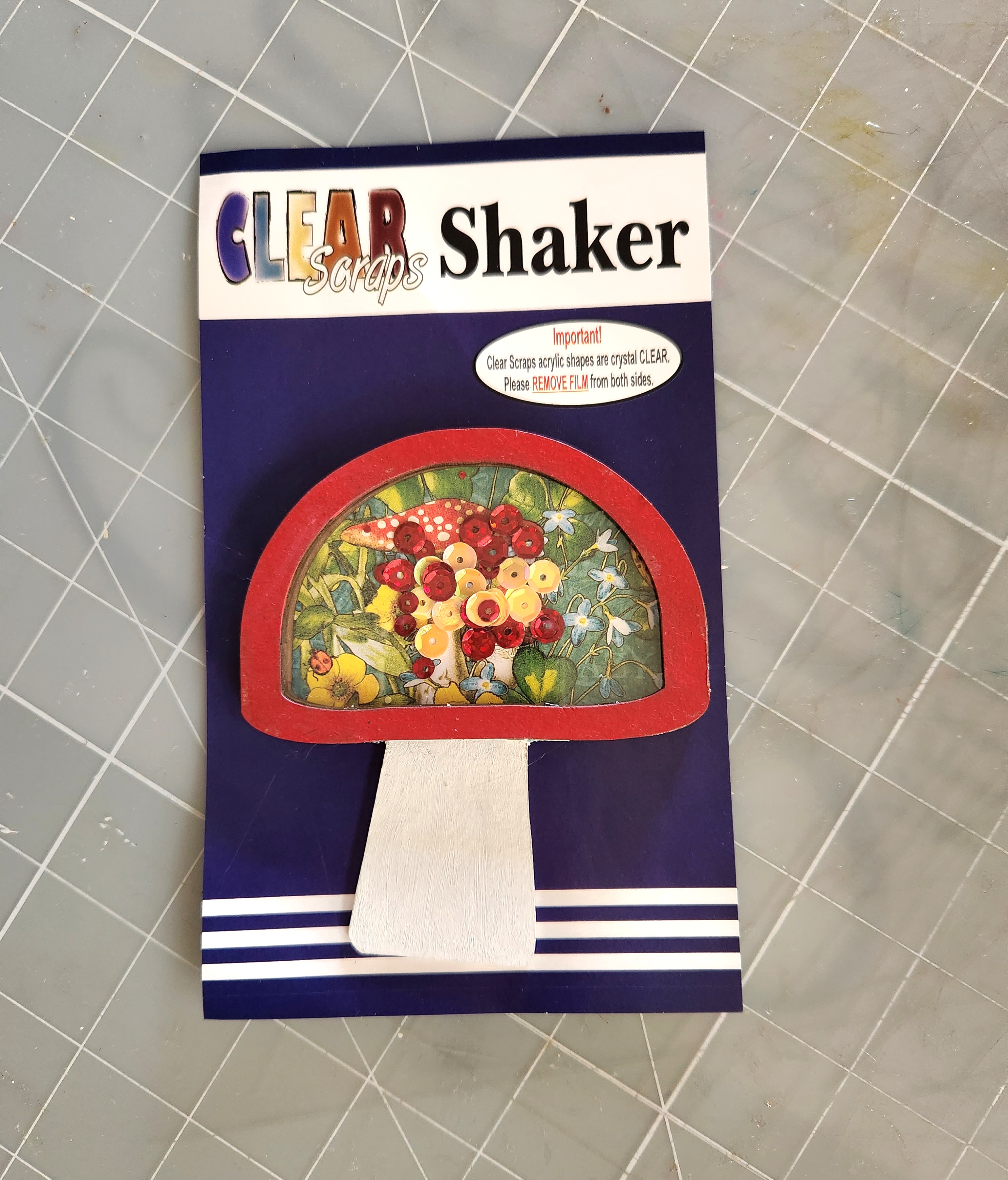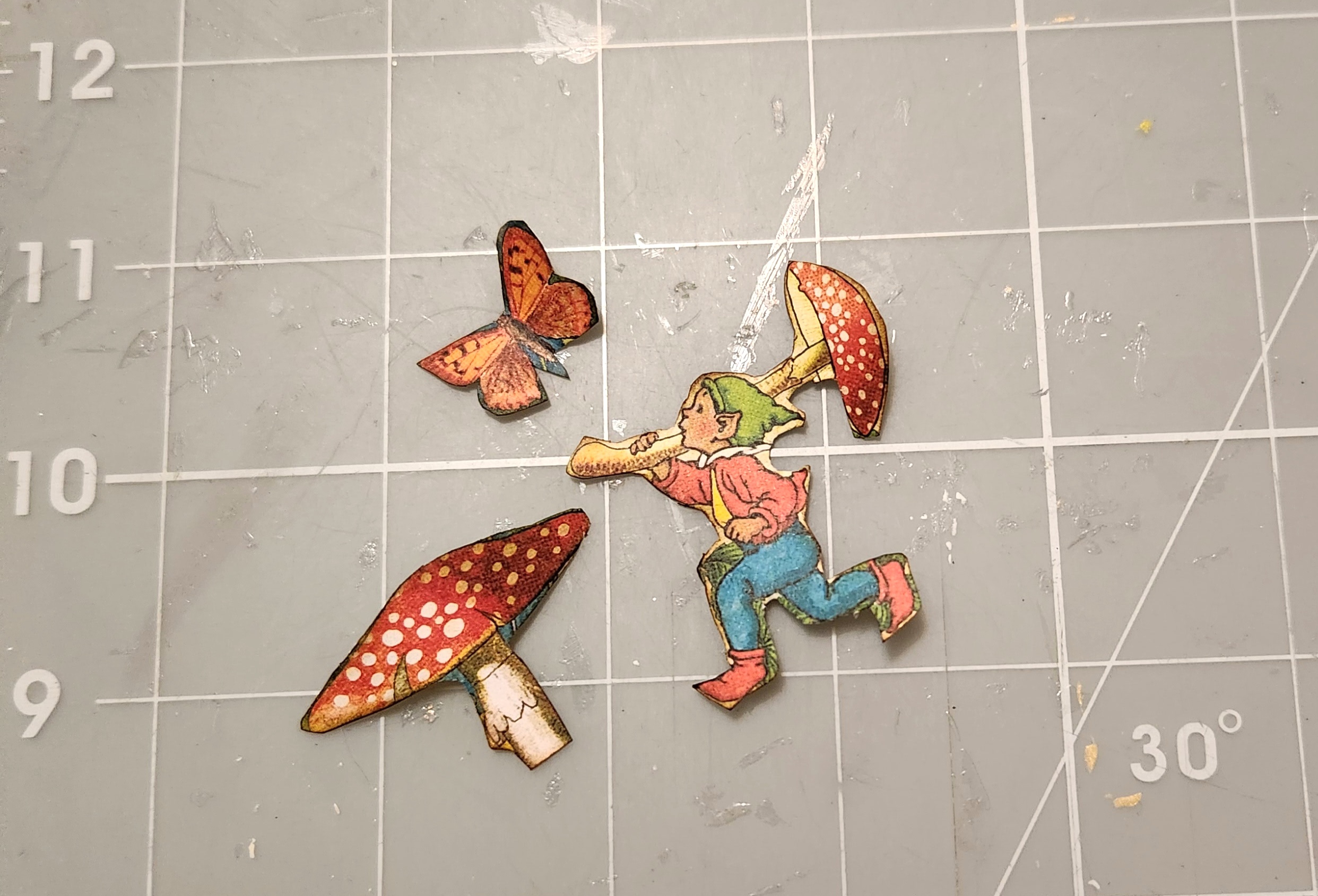 Then I adhered my butterfly at the top of my mushroom shaker. I slightly bent my mushroom paper piece to create dimension. Then glued onto the bottom stem of my mushroom. The gnome I adhered foam dots to the back before adhering. Here's a photo for you!