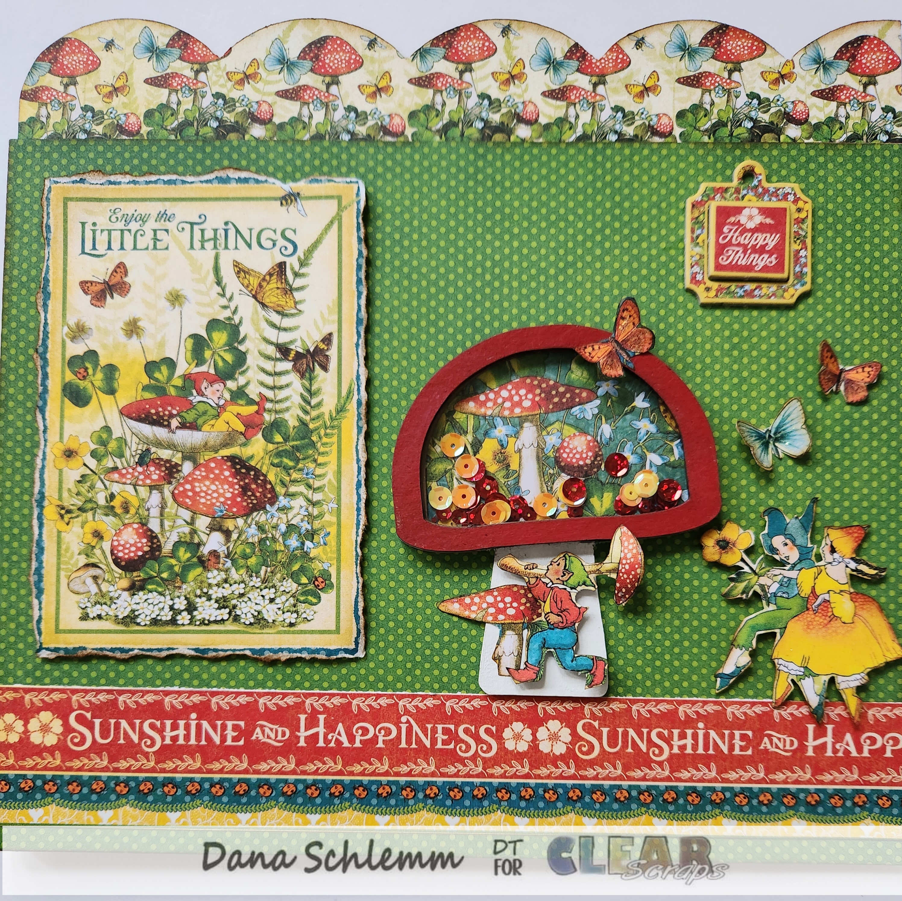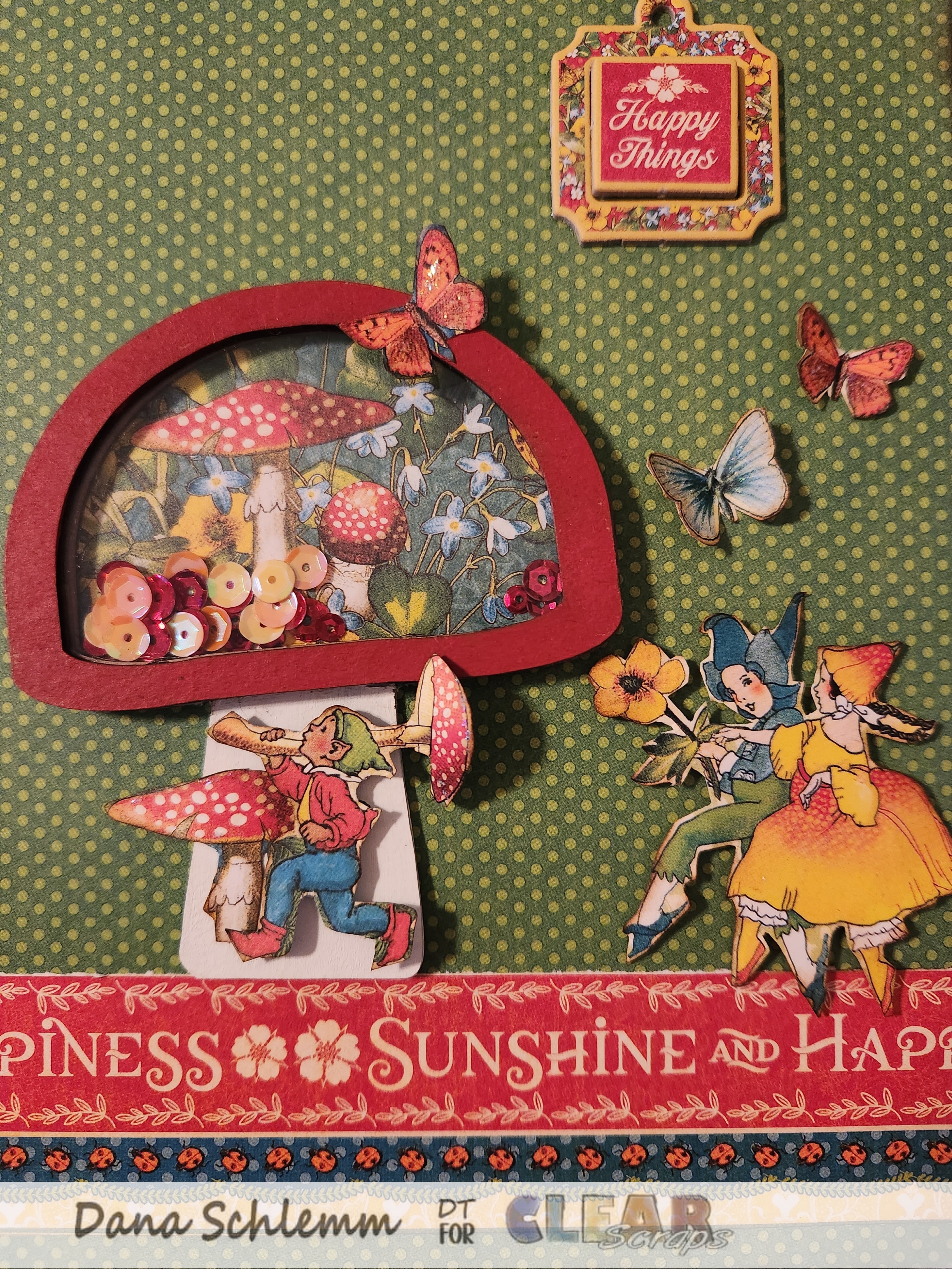 To finish up my project, I glued my mushroom shaker above the sentiment border, next to my flower fairies. I took one of the matching chipboard sentiments and frame (from this paper collection) and glued at the top, along with a gold pearl gem over the hole in my chipboard frame. I attached a metal hanger on the backside of my wood base. Now it's ready to display on your wall!