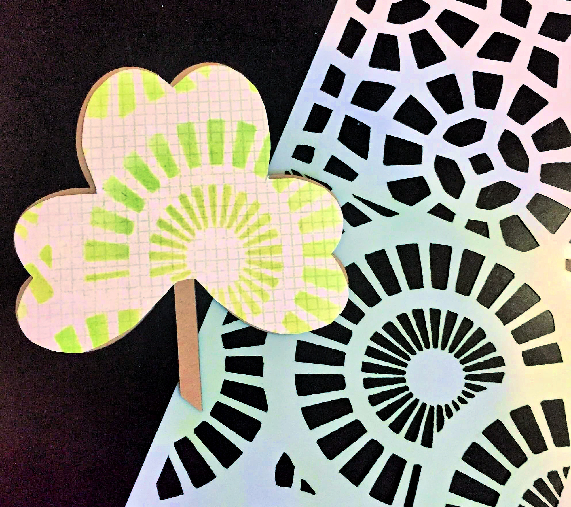 ock was a plain print, so I used the Clear Scraps 5×9 GEO Burst Stencil.