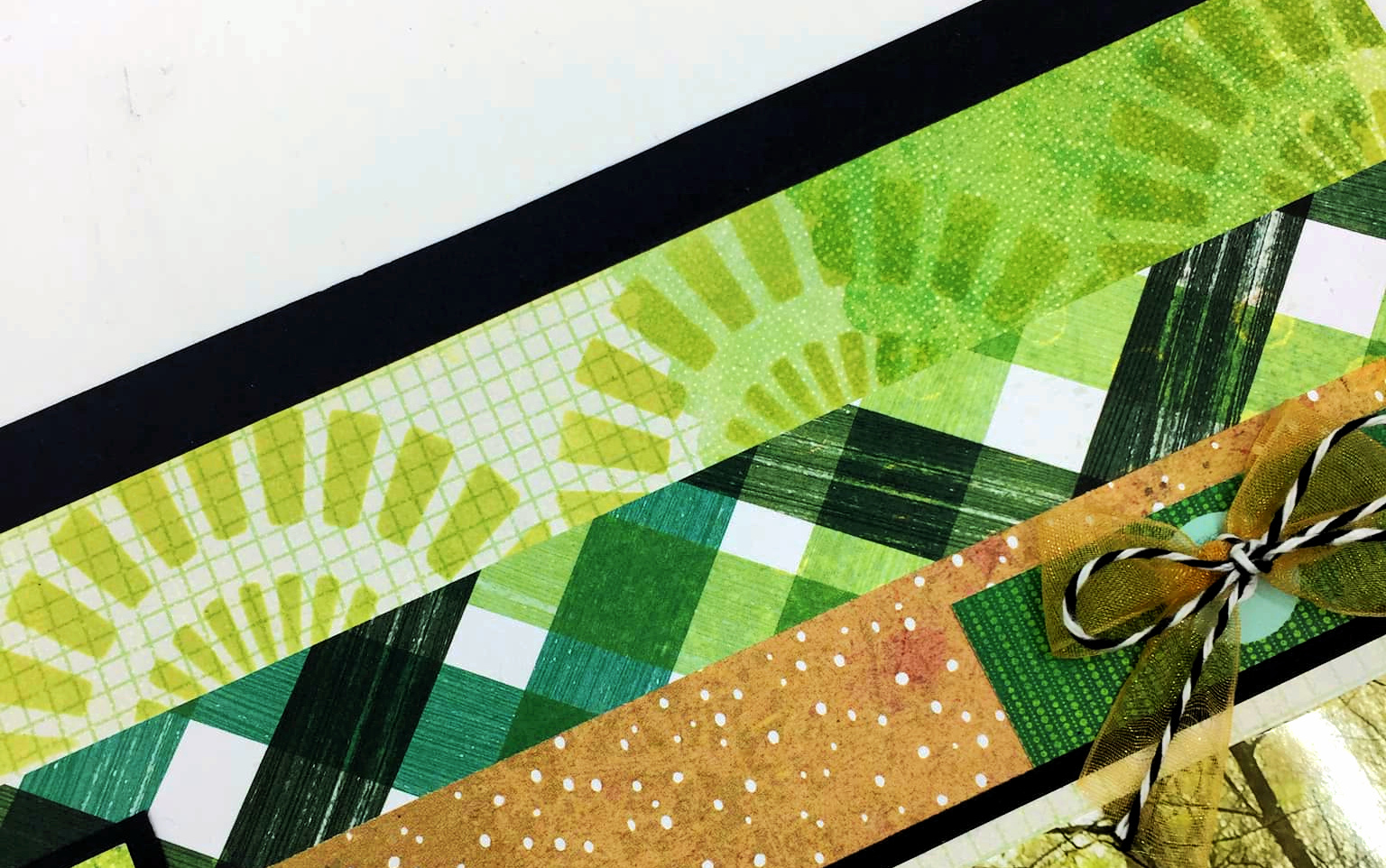 Using a sponge applicator, I swirled a couple of green ink colors together to create this fun background pattern. Before I was done, I added a border using this same stencil to continue this pattern in the LO. It adds a nice extra touch to the plain background.