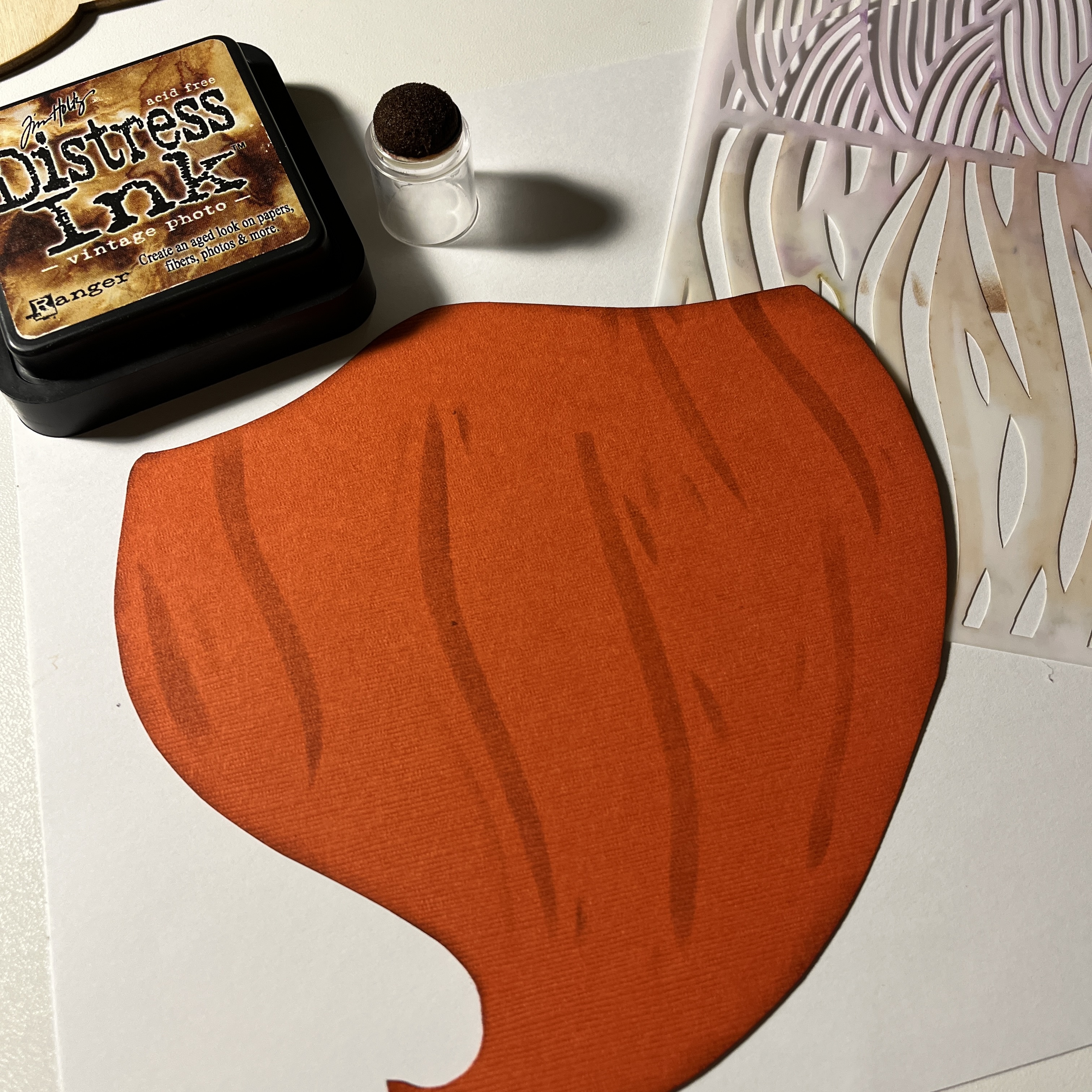 Then, using some brown inks, I've stenciled beard lines in random spots with the 5×9 Wave Strips Stencil. I've used this stencil a lot – it is great to get a realistic look for hair, beards, etc. I've also dusted the edges of the beard and glued it to the wood piece.