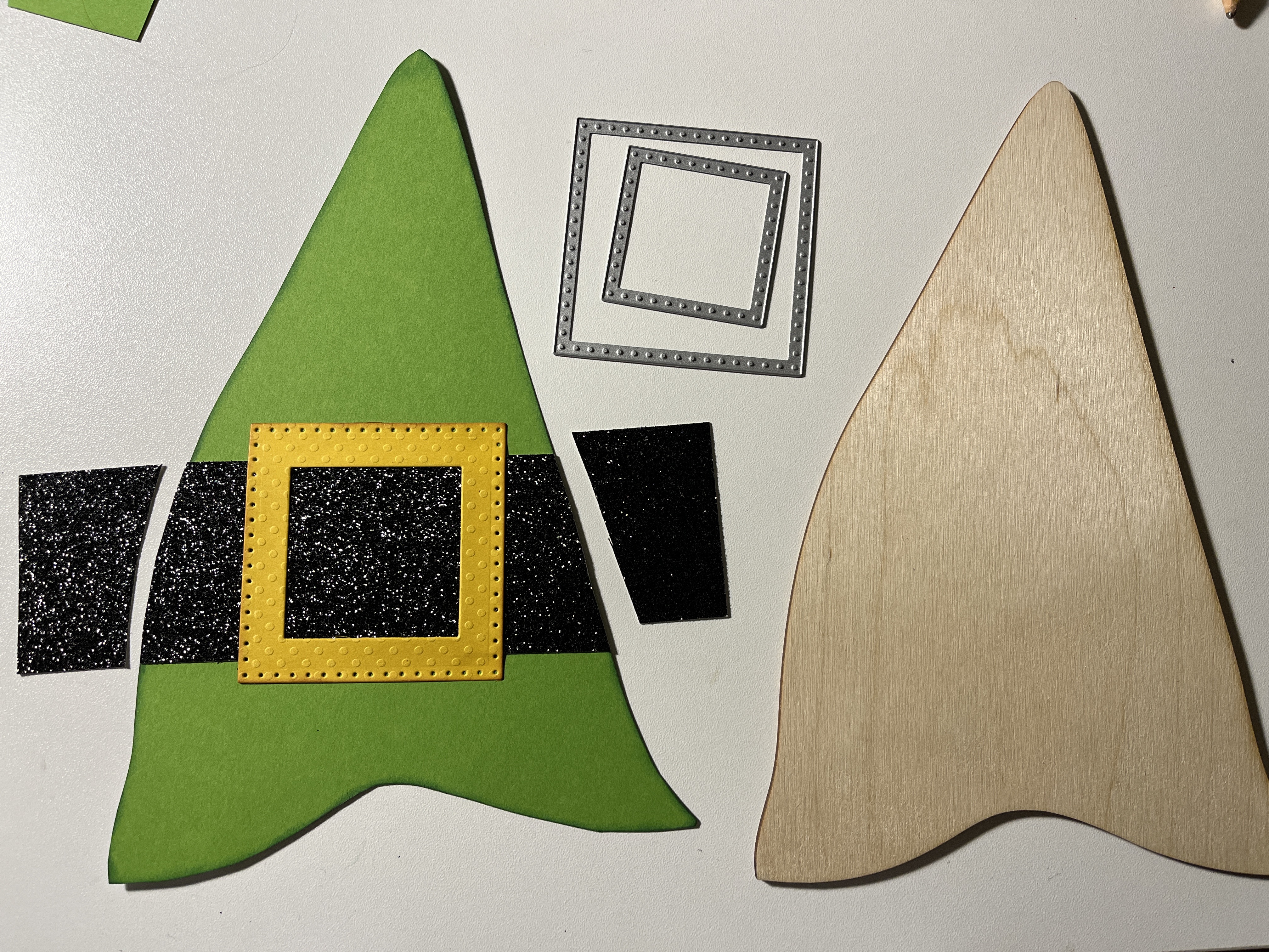 Next I added the buckle on his hat – to make this easy, simply cut a strip about 2" thick of paper (mine is black glitter) and then trim off the ends with a detail scissors. The buckle comes together by taking 2 different square die cuts to yellow paper, cutting out the middle with the smaller square and gluing it on.