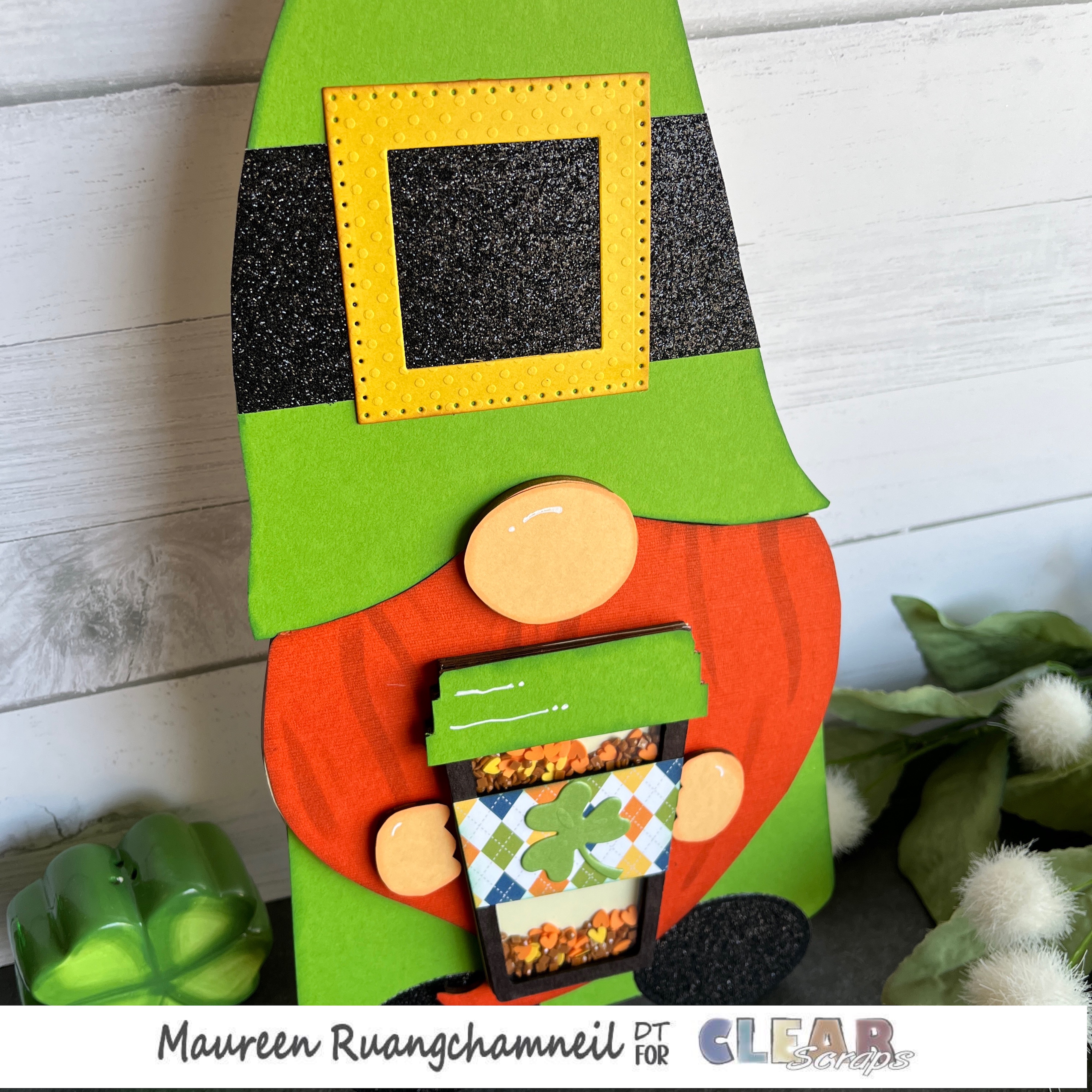 My leprechaun needed something in his hands – so I added a cup of coffee, of course! He is holding the Coffee Cup Mini Shaker, decorated with layers of papers traced out and glued on the top layer. The shaker is filled with brown, orange and yellow shaker bits.