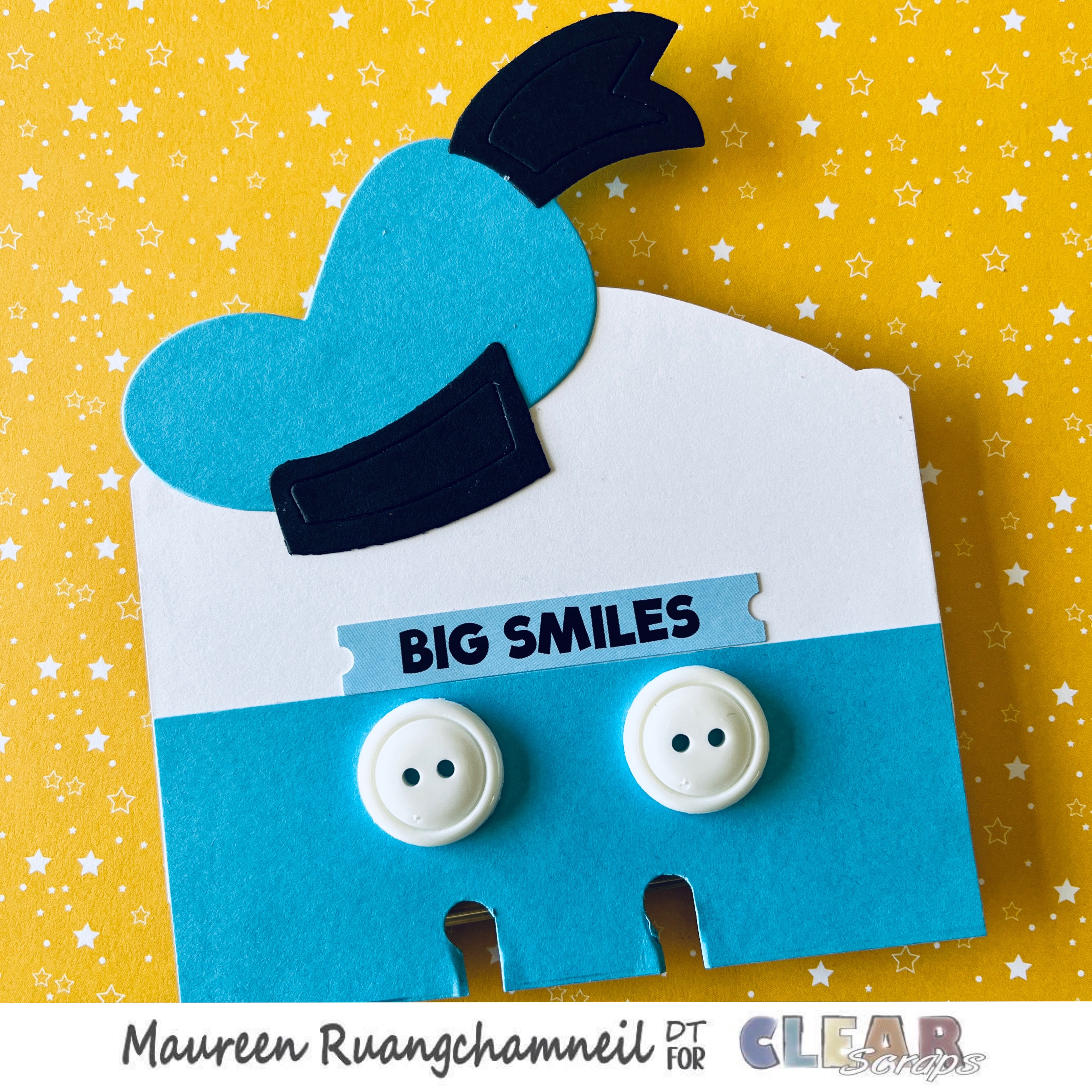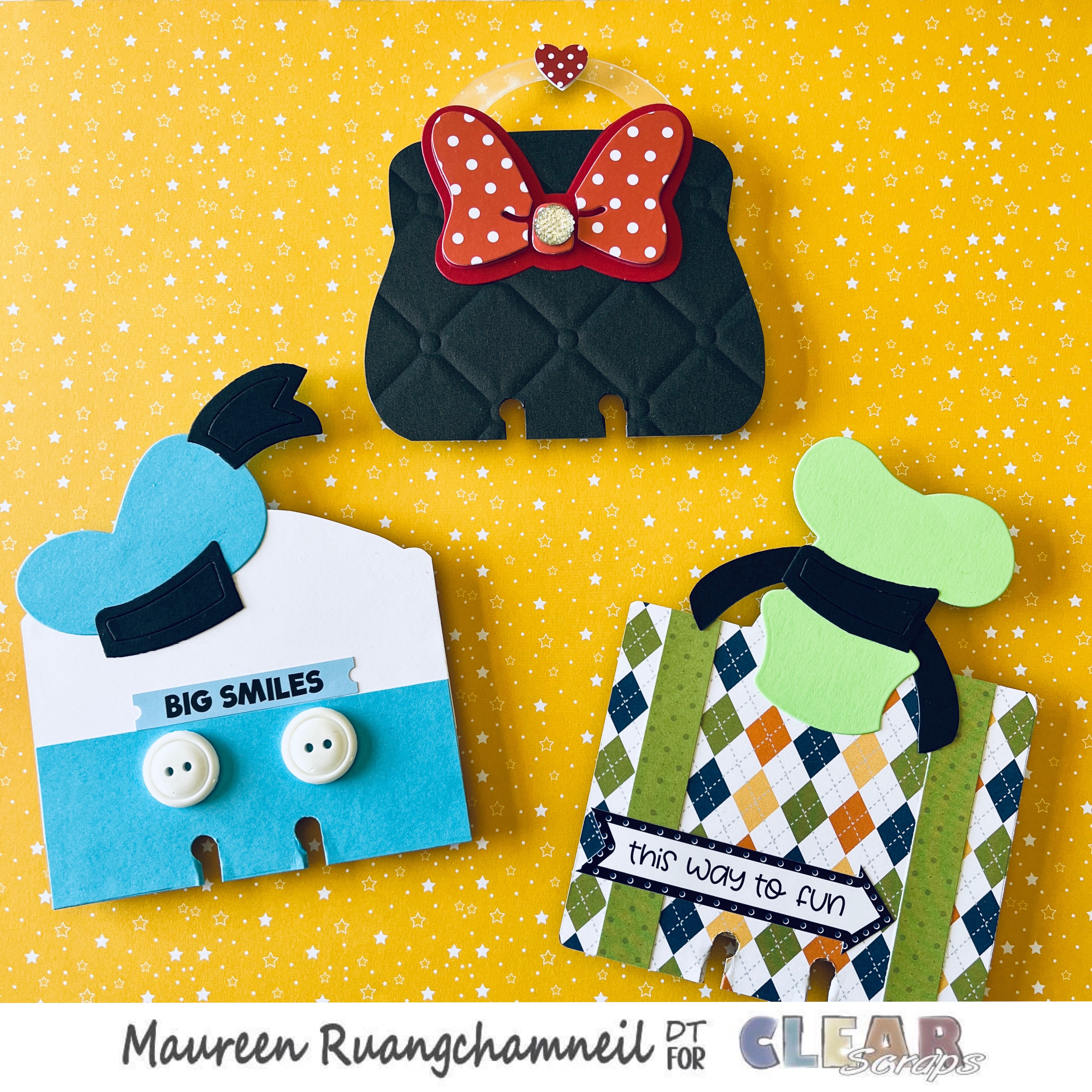 Supplies: black paint, hot glue gun, assorted card stock, character die cuts by Queen and Company, patterned paper and sentiments by Photo Play, buttons, Spellbinders quilted embossing folder, Cricut and Disney files