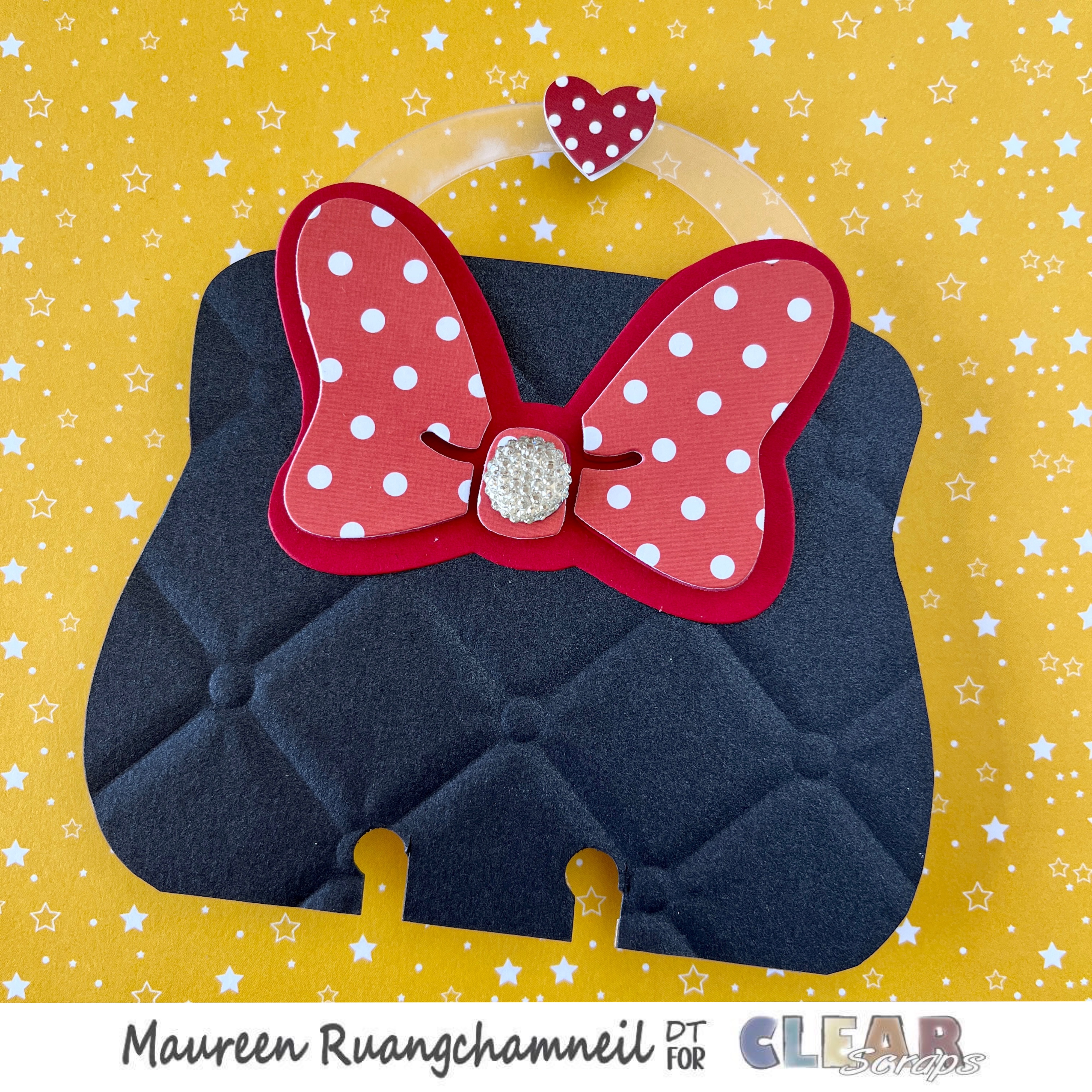 For my dividers, I picked a couple different shapes. The first is this Minnie Mouse purse, done with one of the Purse Acrylic Dividers. It's so cute! I really love the black shimmery card stock. It's embossed with a quilted embossing folder.