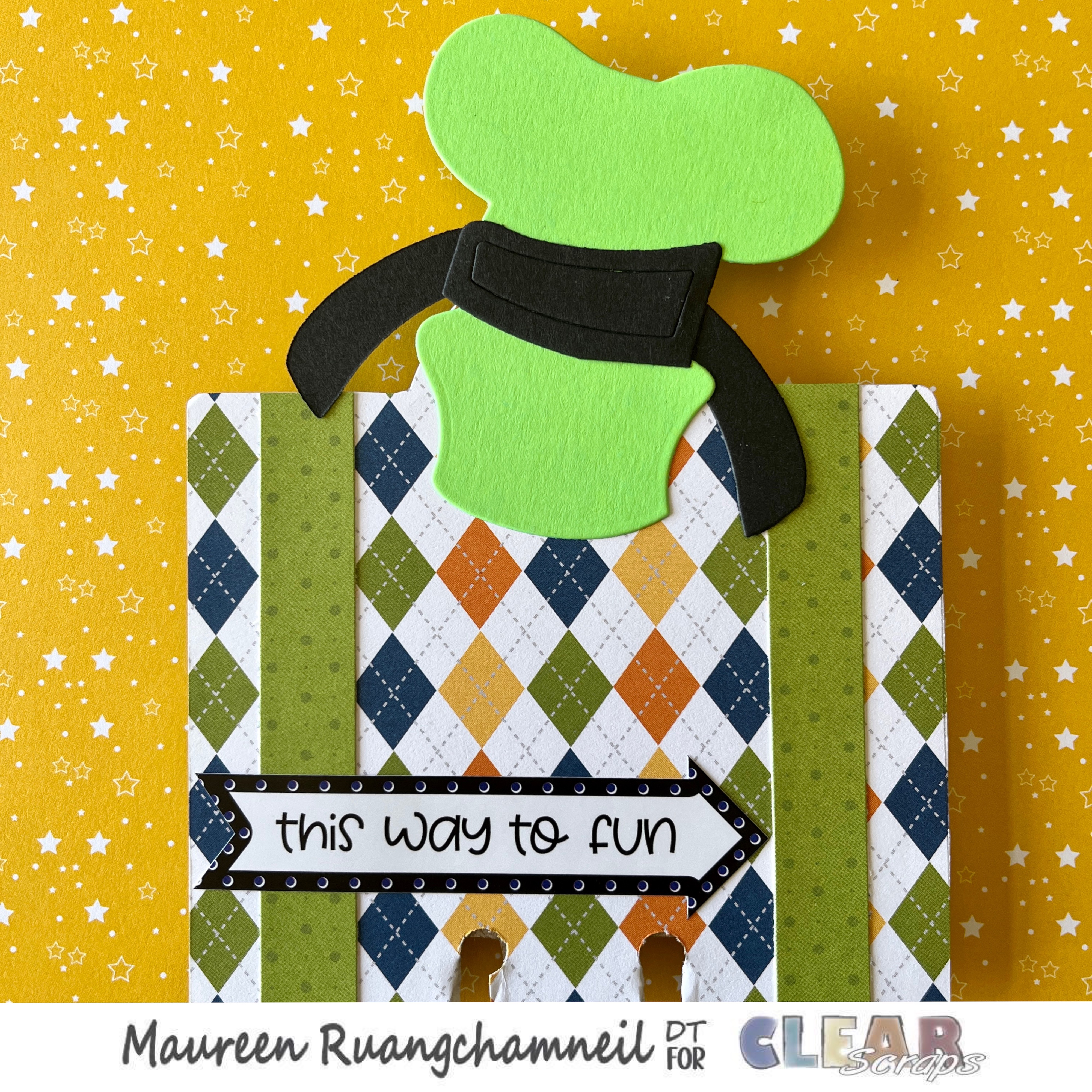 My next divider is a Goofy theme, done with one of the Rounded Tab Chipboard Dividers. This one is traced and covered in an argyle print paper and I add a Goofy hat to the top. I'm using stickers from a paper set in my stash.