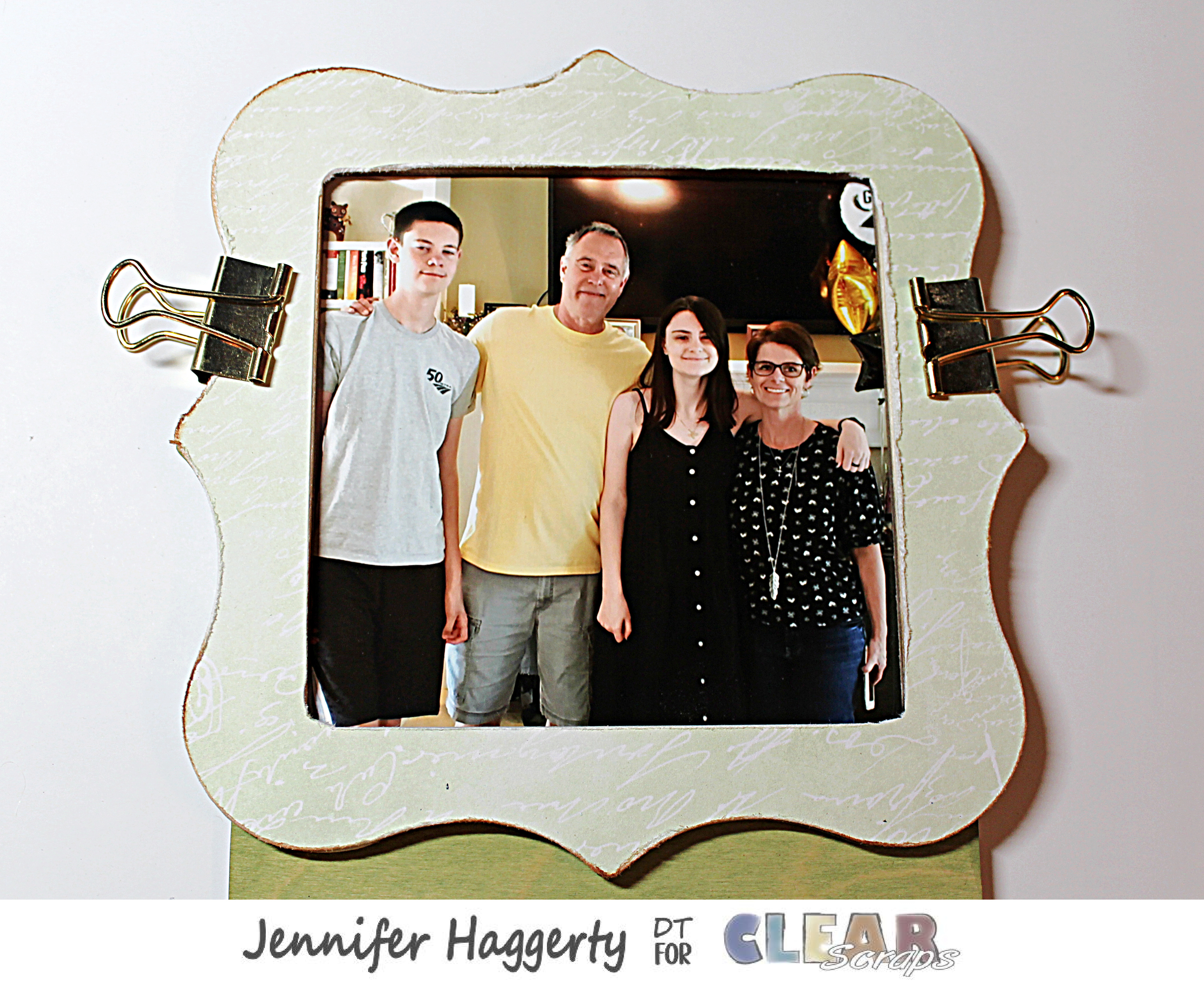 I cut down a photo to 4 1/4 x 4 1/4 inches and adhered to the back of my frame. Using my Beacon Adhesive, I affixed the two parts of the frame together. I then used some clips to hold them while my glue dried.