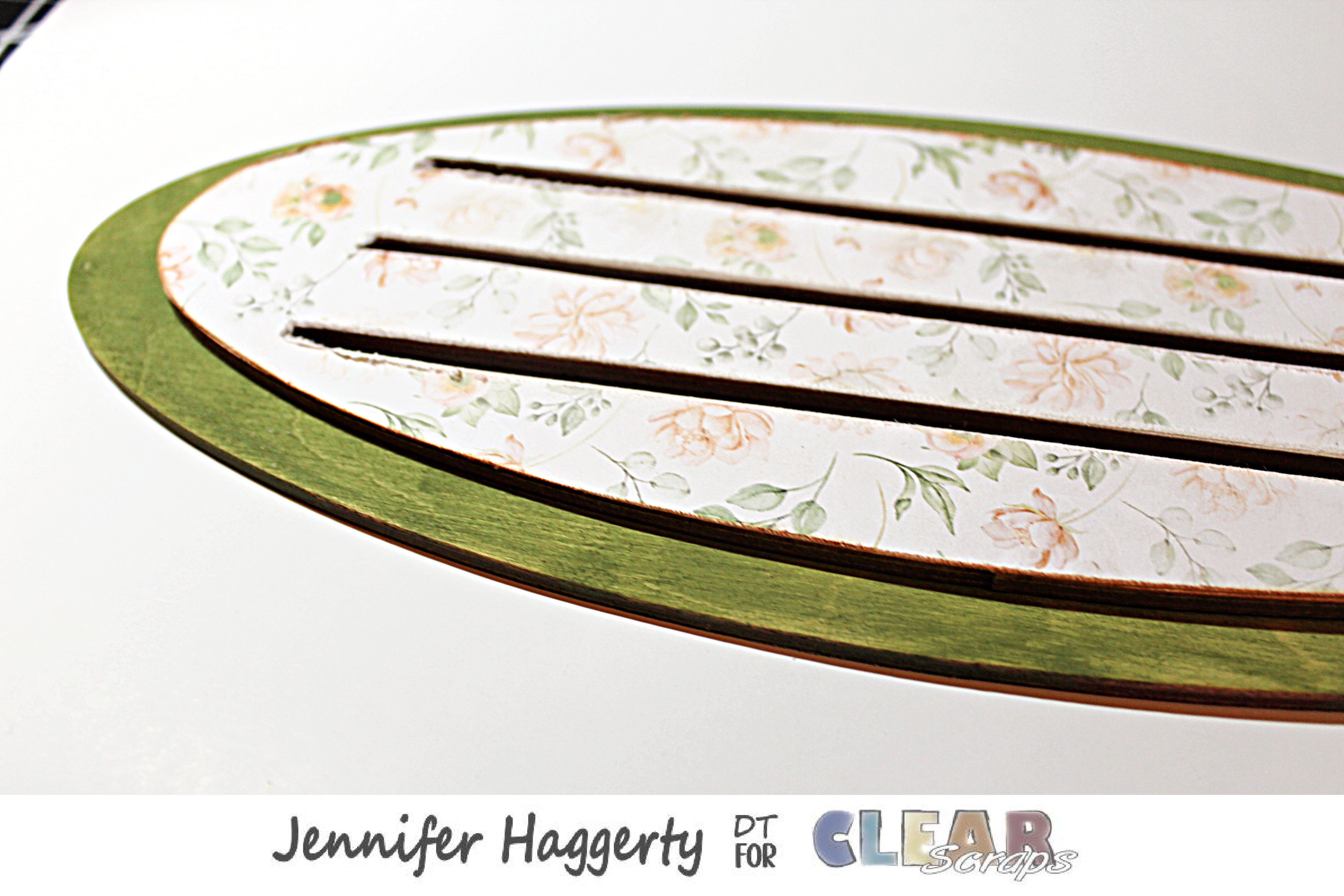 I began by working on my base; I painted the larger oval with a nice green chalk paint. For the smaller oval, I used my Beacon 3-in-1 Adhesive to cover it with floral paper. I followed by using my x-acto knife and sanding tool to smooth the edges.