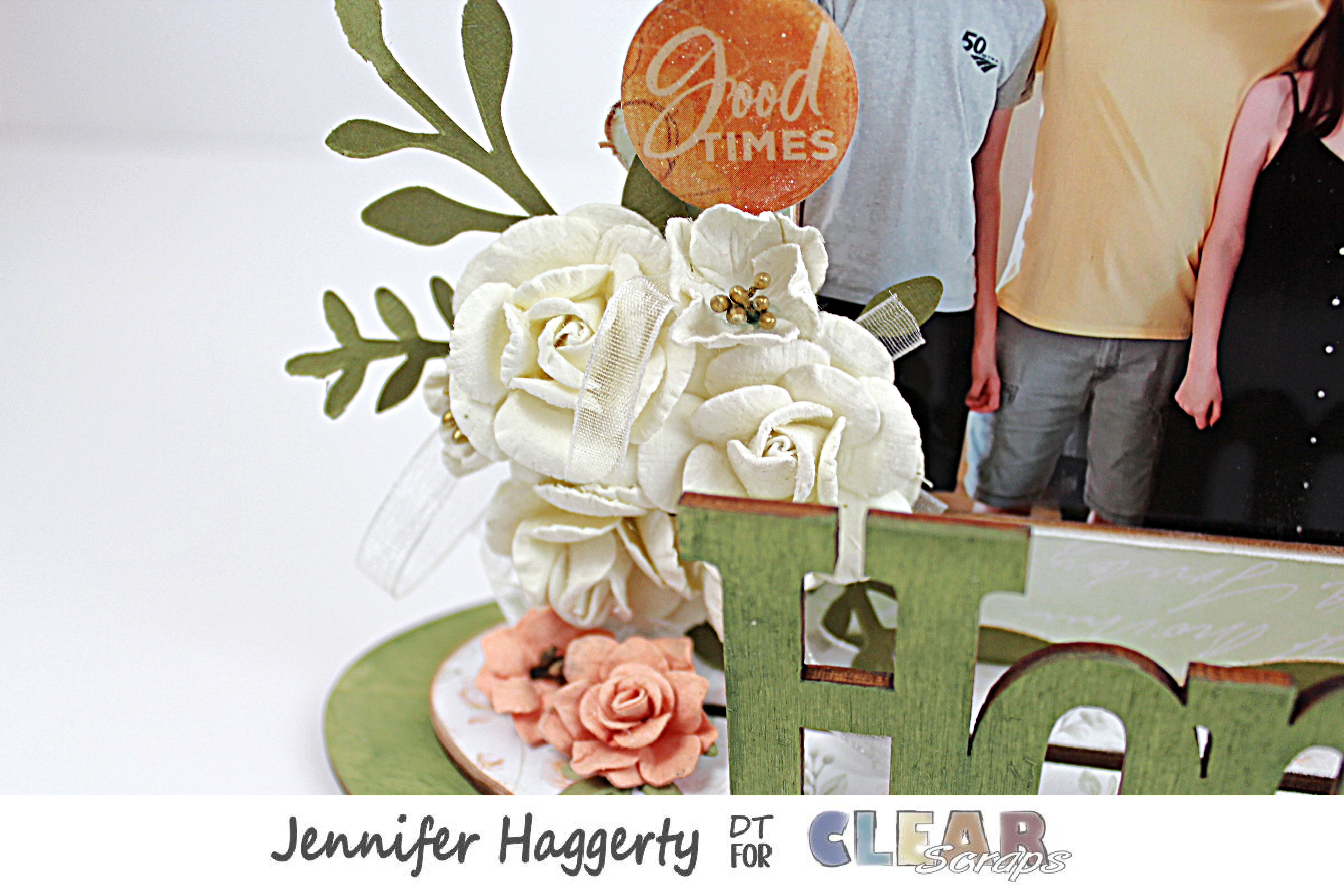 Once I assembled my 3D Frameables, I glued some the floral clusters around my frame and to the right of my House for accent. I also used the round epoxy sentiments included in the kit as a nice pop of color.