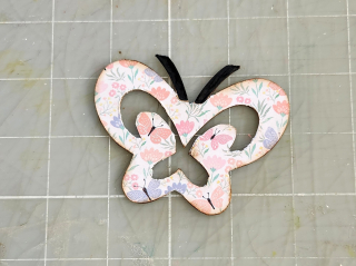 Take your chipboard butterfly embellishment and trace onto a coordinating paper. Then cut out and glue onto your chipboard butterfly piece. I painted the antennas on my butterfly using acrylic Black paint. Set aside to dry.