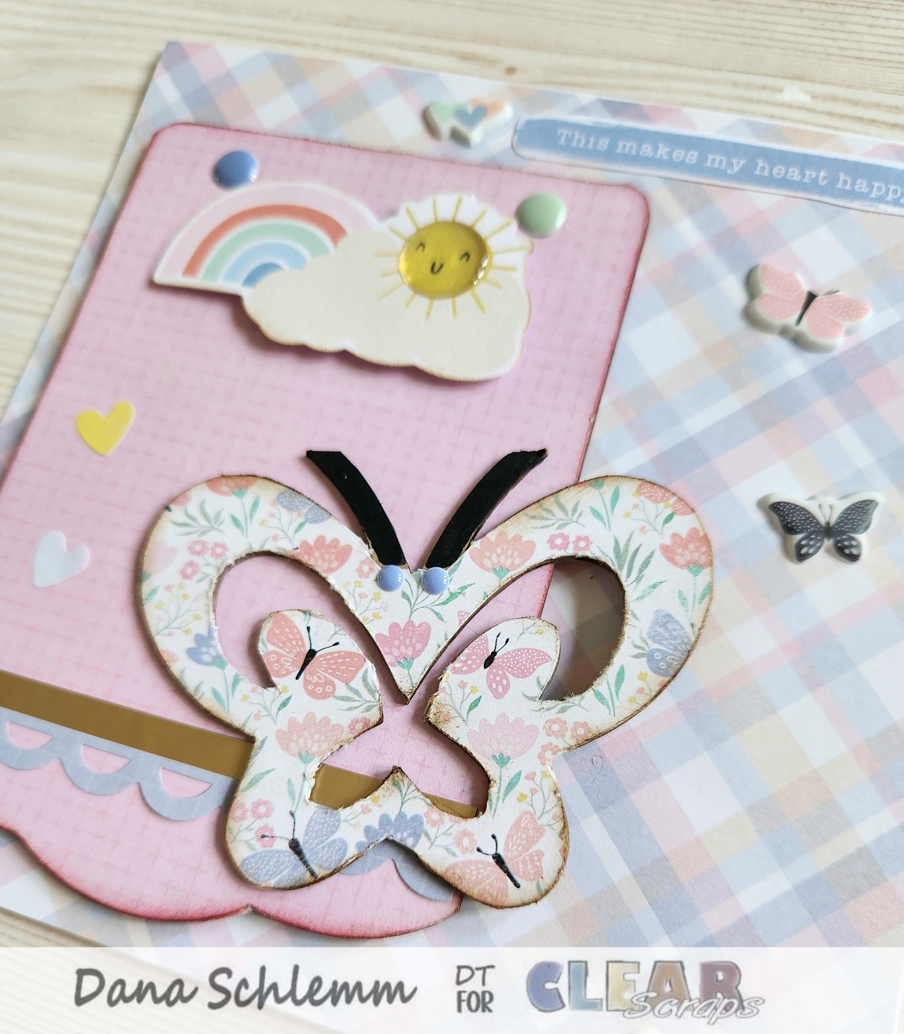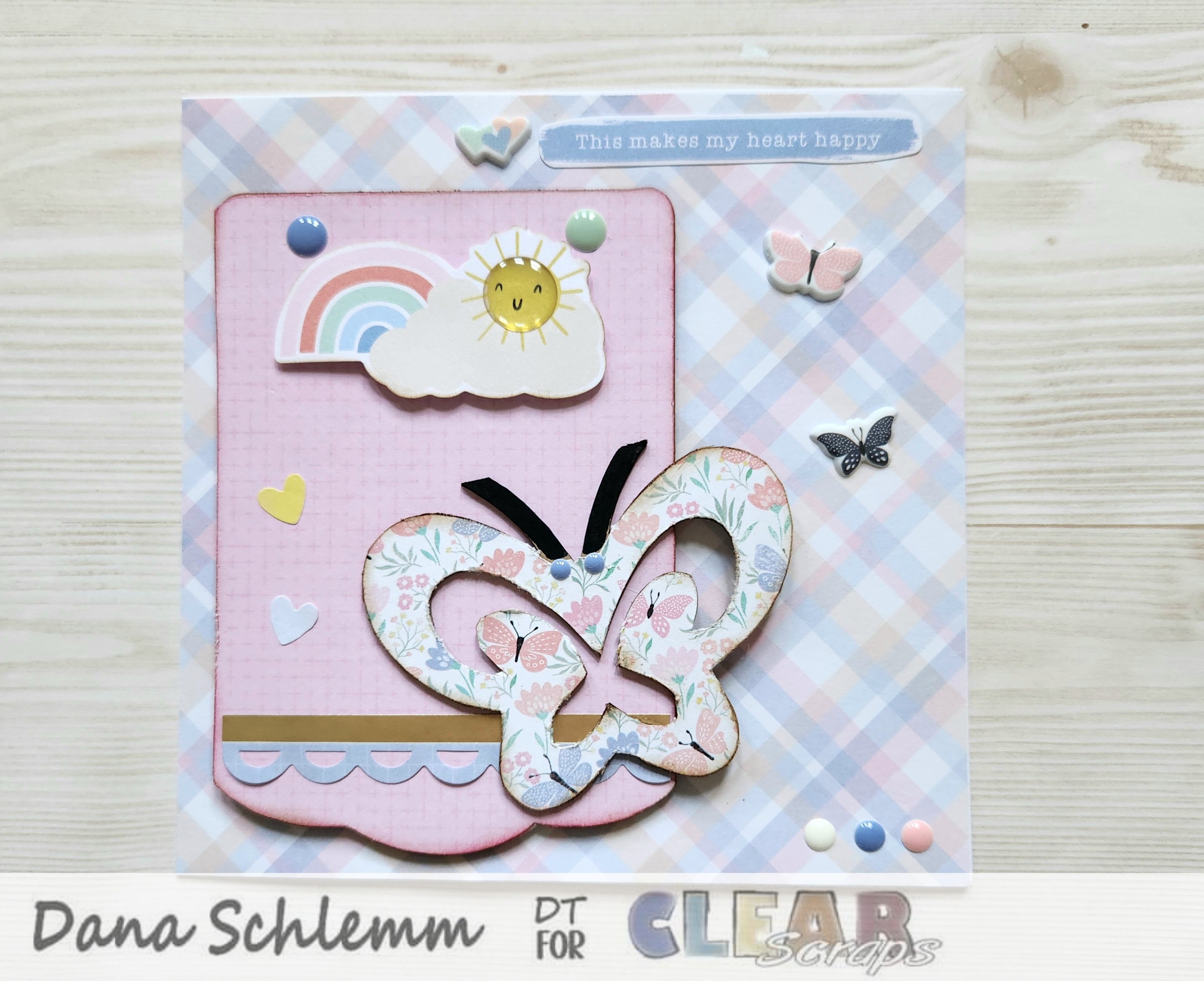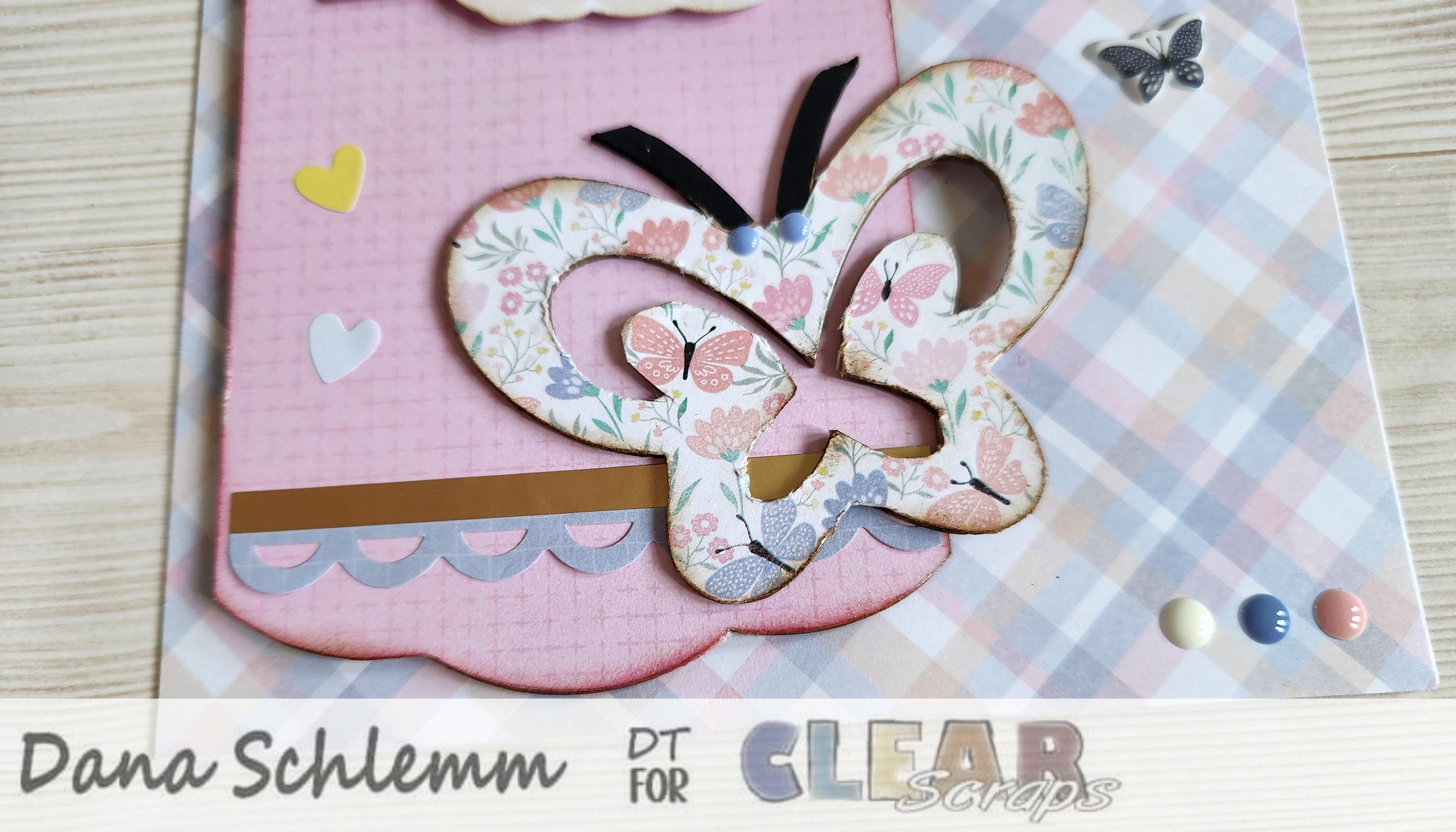 It's Dana here! Today I'll be creating an easy and cute card idea for you. I'm using Clear Scraps Swirl Butterflies chipboard embellishment Click here and one of the Scallop Chipboard album pieces Click here to create my card. The papers I'll be using are from Rosie's Studio "One of a Kind" paper collection. I'll be inking my papers and embellishments using Tim Holtz Distress Ink Gathered Twigs.