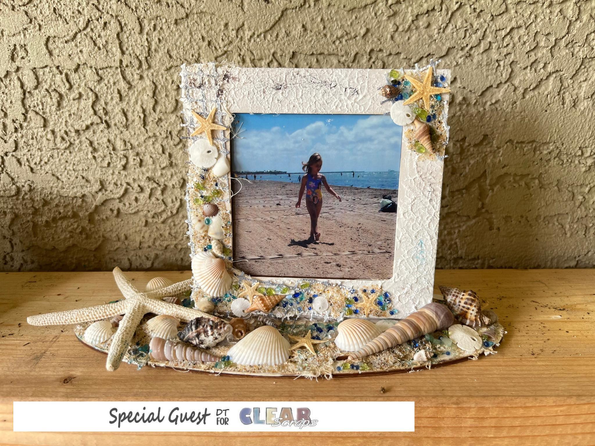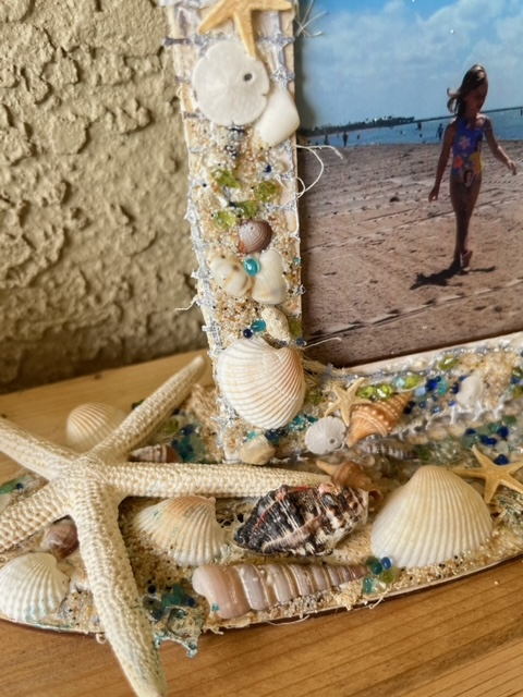 I added crackle paste around the edge of the frame and added more shells, sand and sea glass.