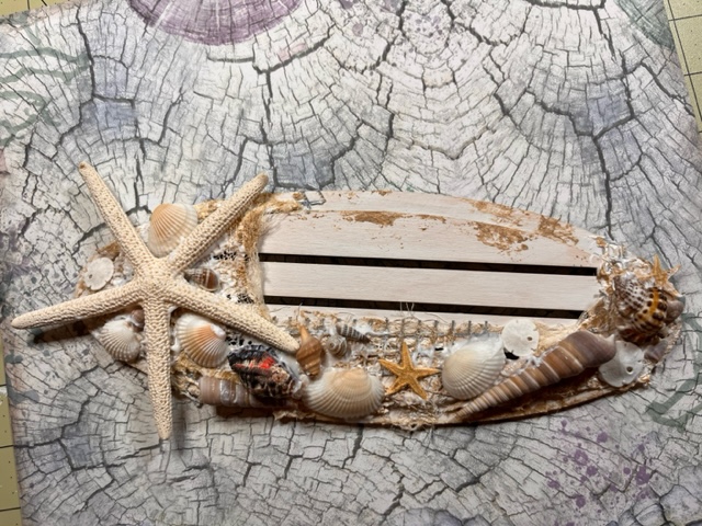 I grabbed some sea glass, beads, sand and small shells by Mudd puddles along with some larger shells and starfish I had and adhered them to the base.