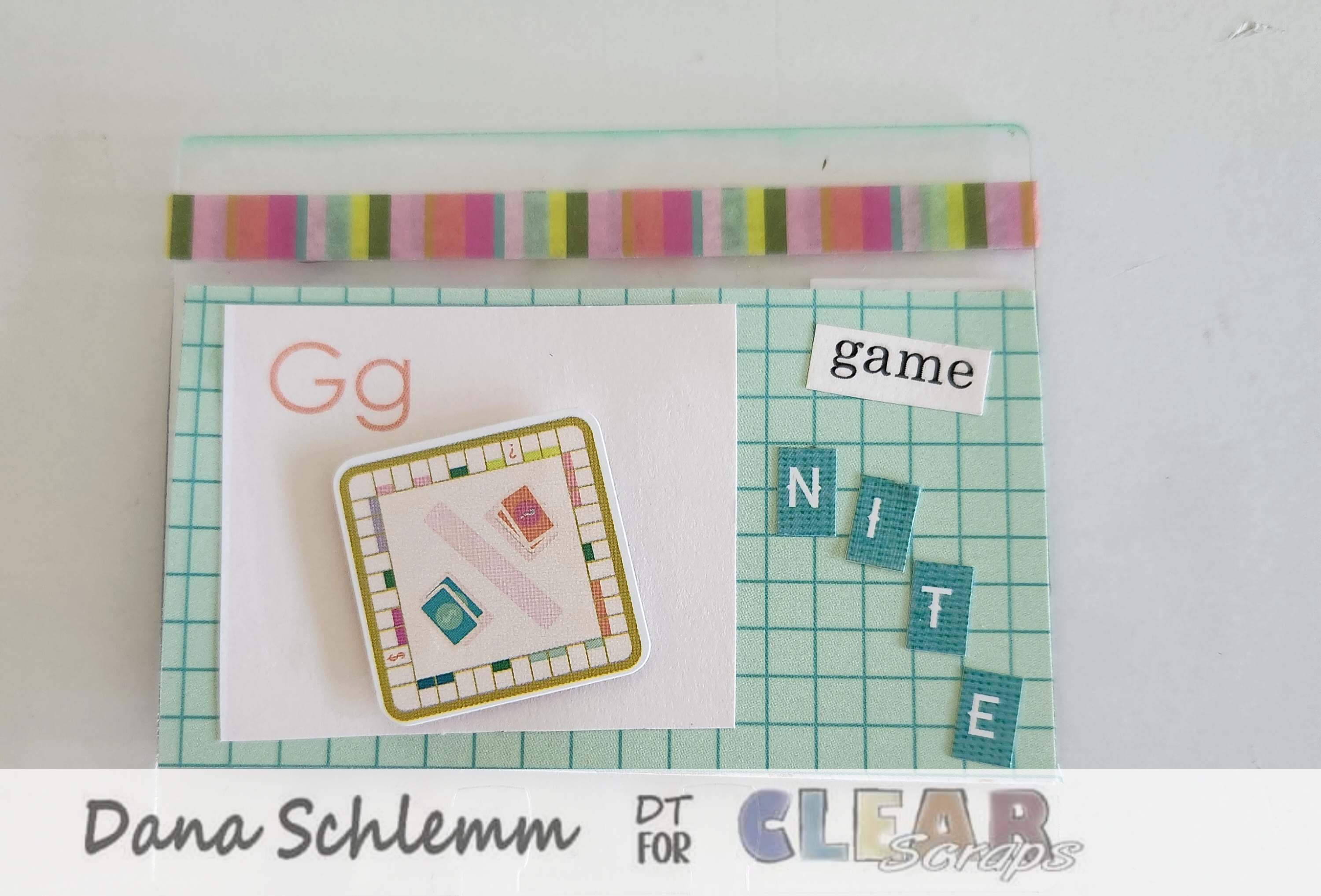 Card 2: I cut a scrap paper and adhered across the middle of my Divider card. I adhered some washi tape along the top edge. I cut out a small game journal card and glued onto my card. Using foam dots I adhered a matching game sticker, Game nite sentiment stickers.