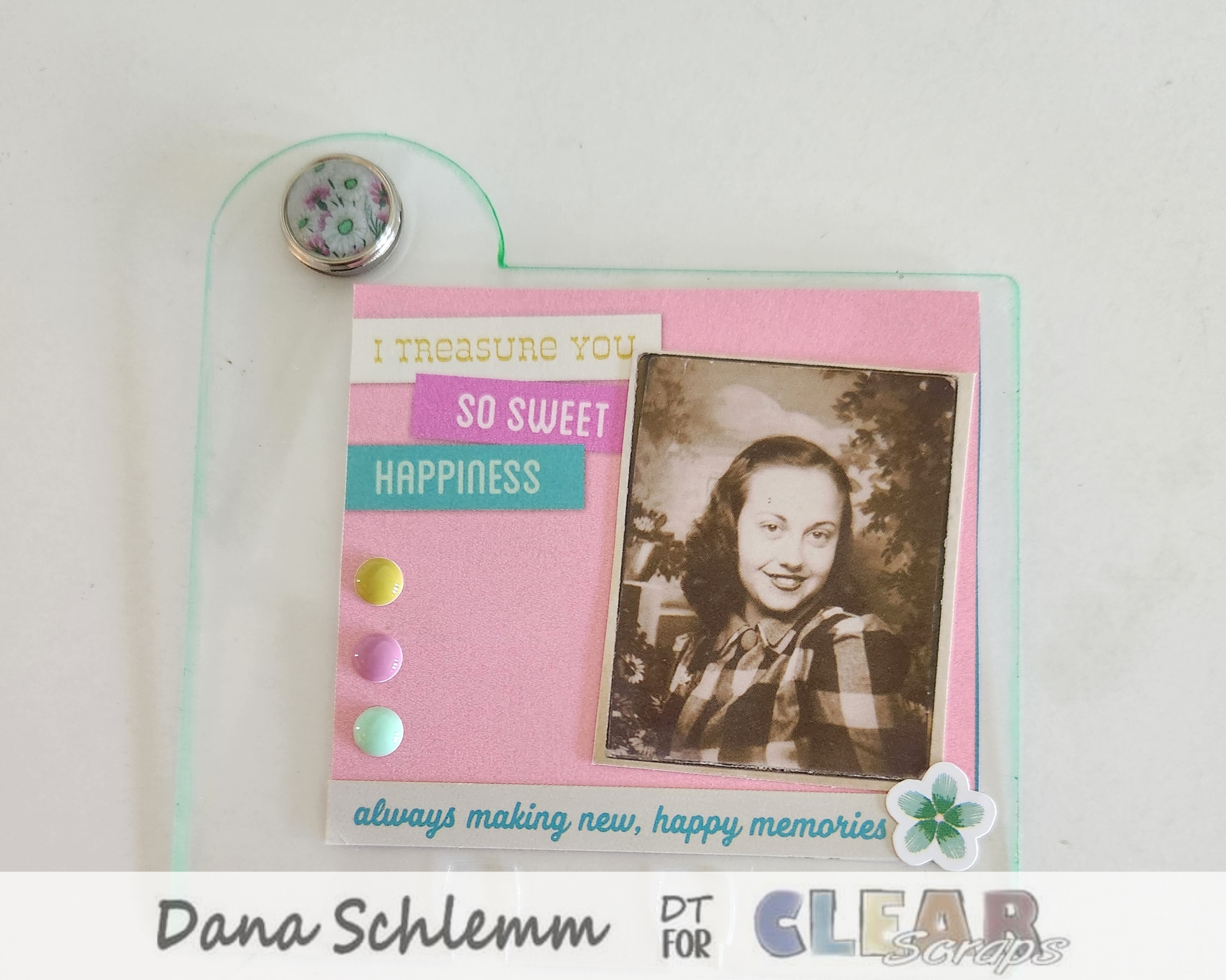 Card 3: I cut down to size a small journal card and glued in the center. Added a photo, sentiment sticker at the bottom edge and a few enamel dots on the left side. One larger brad on the acrylic tab. These cards are a great way to display treasured photos!