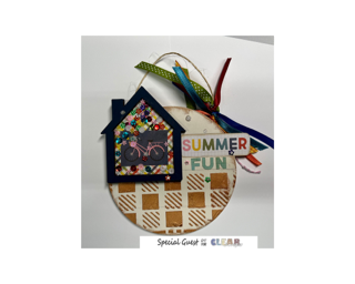 Next I used the Clear Scraps 5×9 Plaids Mixer Stencil and a texture paste just on the bottom half. I used scraps of paper for the Clear Scraps House Mini Shaker Shape and a mixture of sequins. Attached a hanger, scraps of ribbon and some crystals.