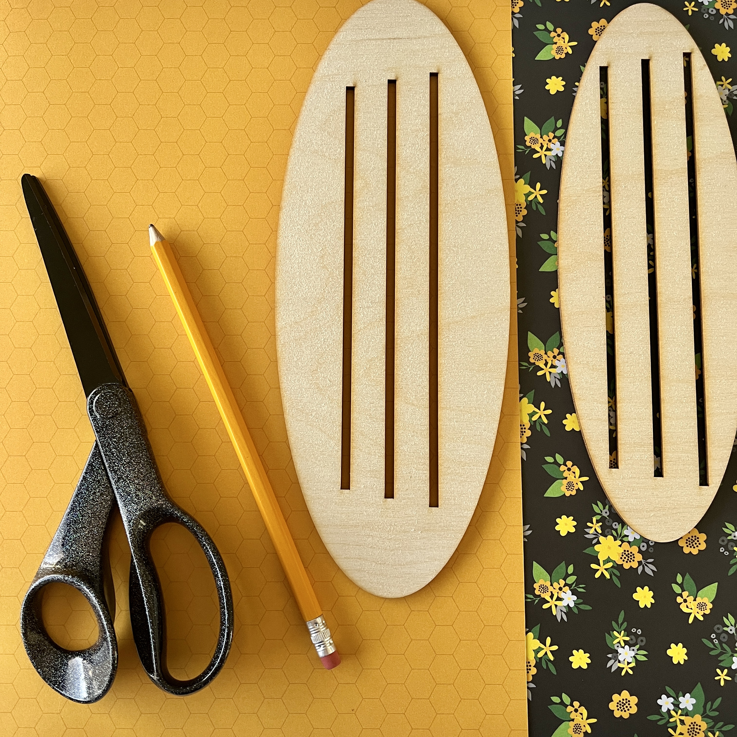 My first step is to trace out the papers I wanted for the base, and then use a sharp blade to cut out the strips in the middle. These are glued to the top. You can also use decoupage! I've done the same with the frame and glued that on to the front.