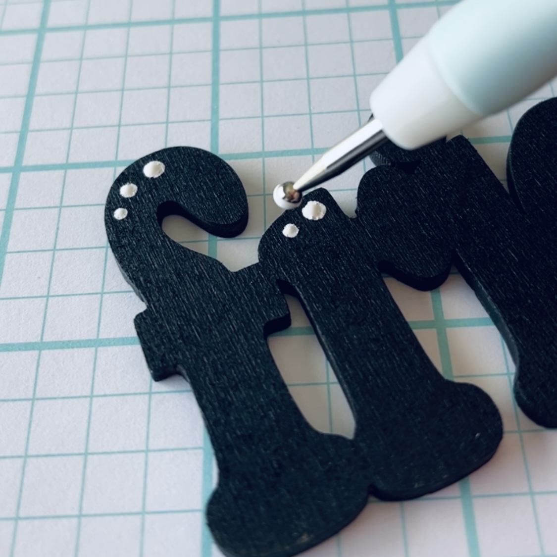 For the phrase "friends" I've painted it on both sides in a black acrylic paint. Then, after it was dry, I covered it in white paint dots. I did this using an embossing tool also – these are handy tools to have in your craft room!