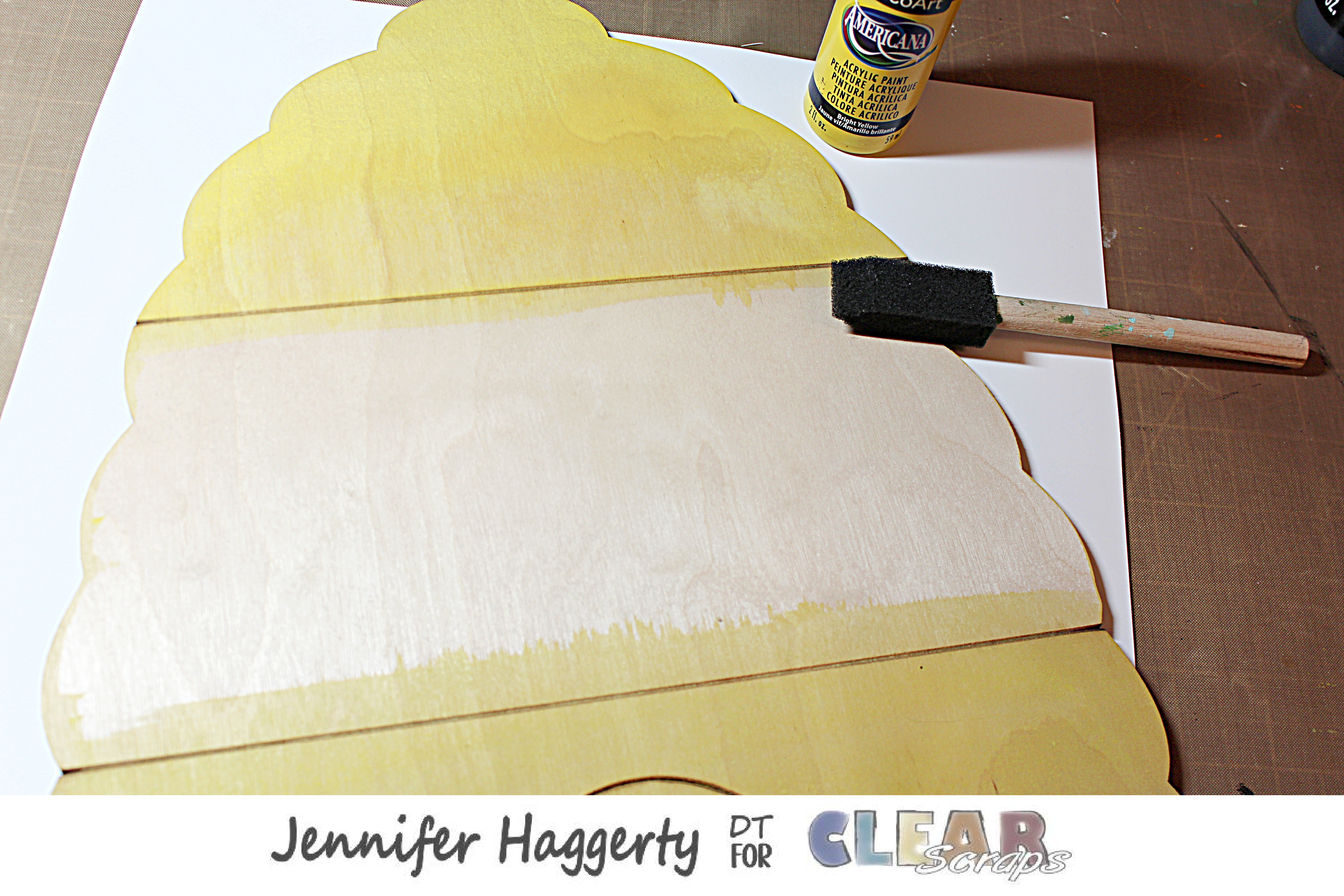 I began by using yellow acrylic paint thinned out with some water. I wanted my yellow to be a little more muted. I applied my paint to the top and bottom of my Beehive Medium Shiplap Shape.