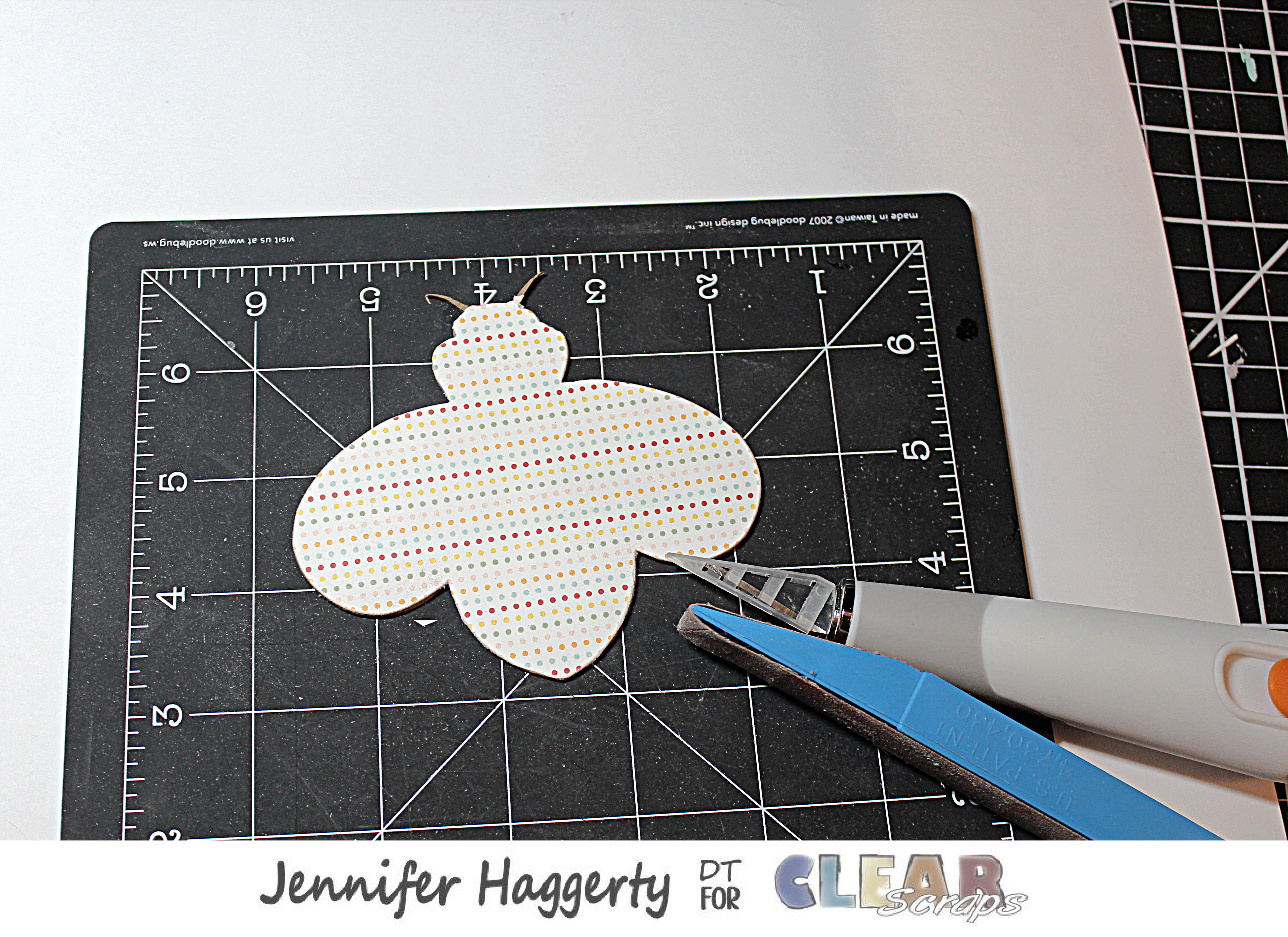 I set my Shiplap Shape aside to dry while working on my Mini Shaker Shape! The Bee Mini Shaker is the perfect accent to the Beehive! I started by covering the chipboard base with patterned paper using my Beacon 3-in-1 Adhesive. I trimmed away excess paper with scissors and followed up with my x-acto knife and sanding tool.