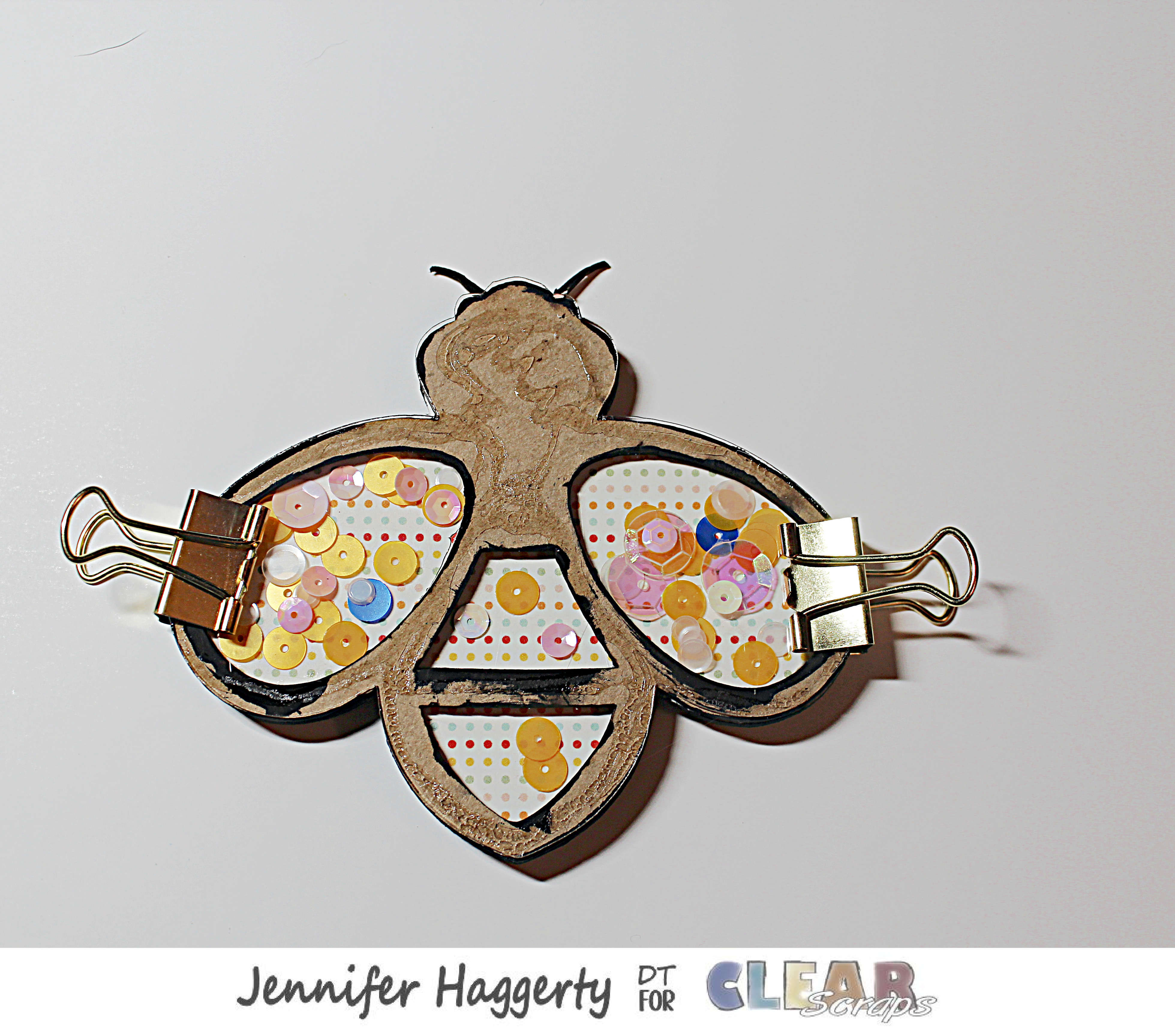 Once I adhered my two inside chipboard frames, I was ready to add some coordinating sequins. Again using my Beacon Adhesive, I adhered the acrylic overlay. I used clips to secure my Mini Shaker while drying.