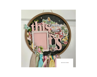 I am using a craft round found at a local craft store, you can use an embroidery hoop. I left mine natural in color. Using a beautiful line from Simple Stories, I used elements to layer and create a stage for the frame.