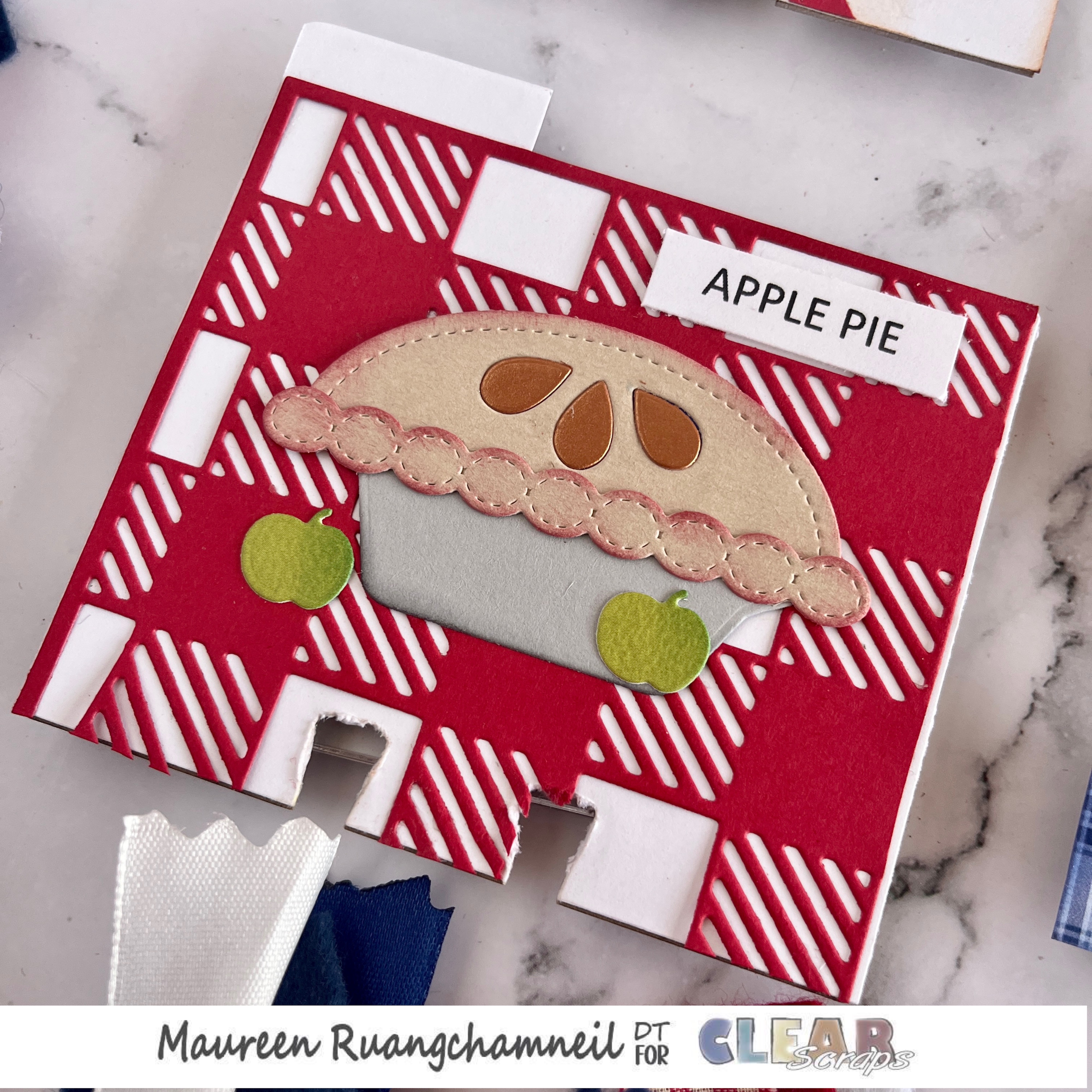 First up, the tabbed dividers. I wanted these to look like a picnic table since both were a food theme. I used a gingham die cut in red for the backdrop, and the dividers I traced on some white paper. These were glued together.