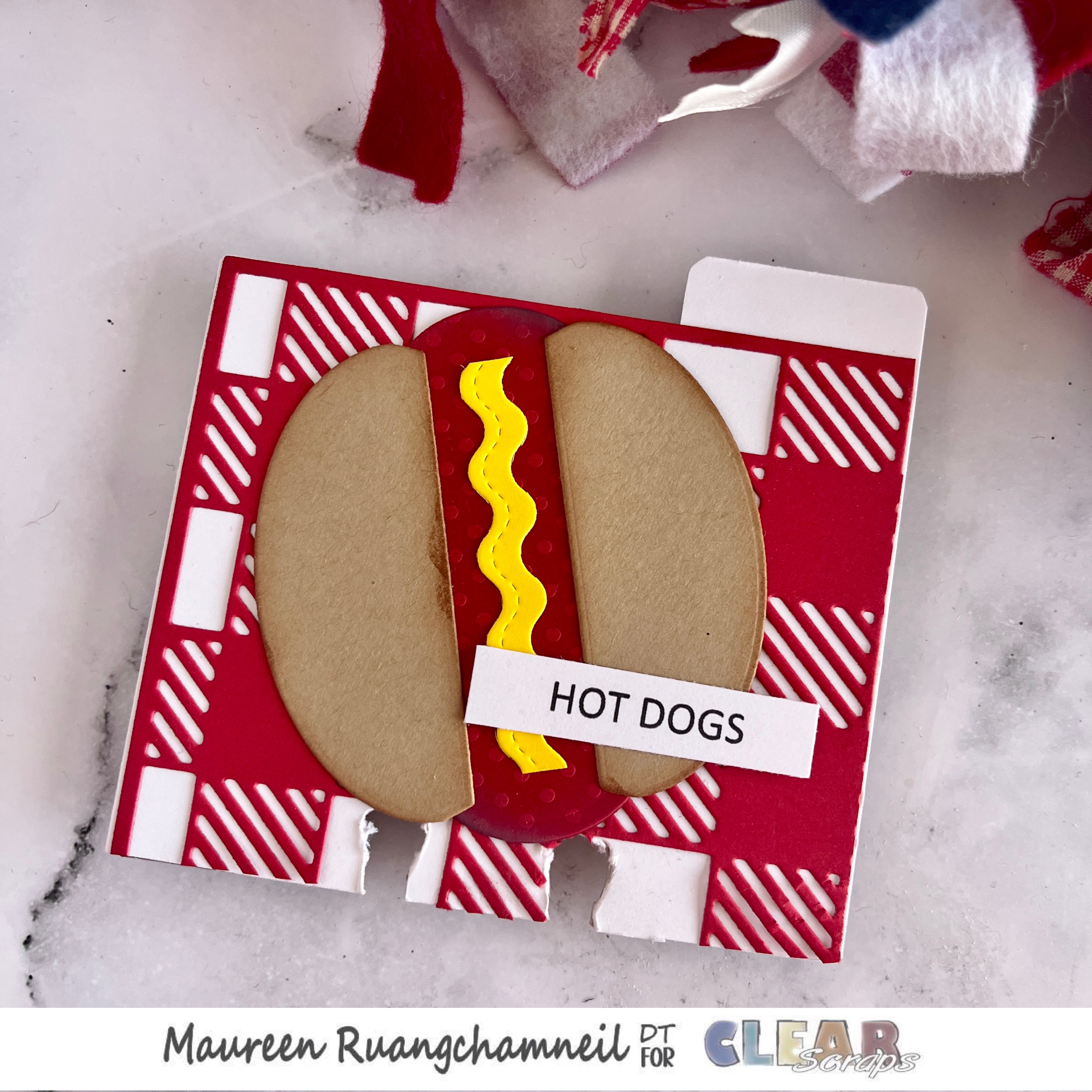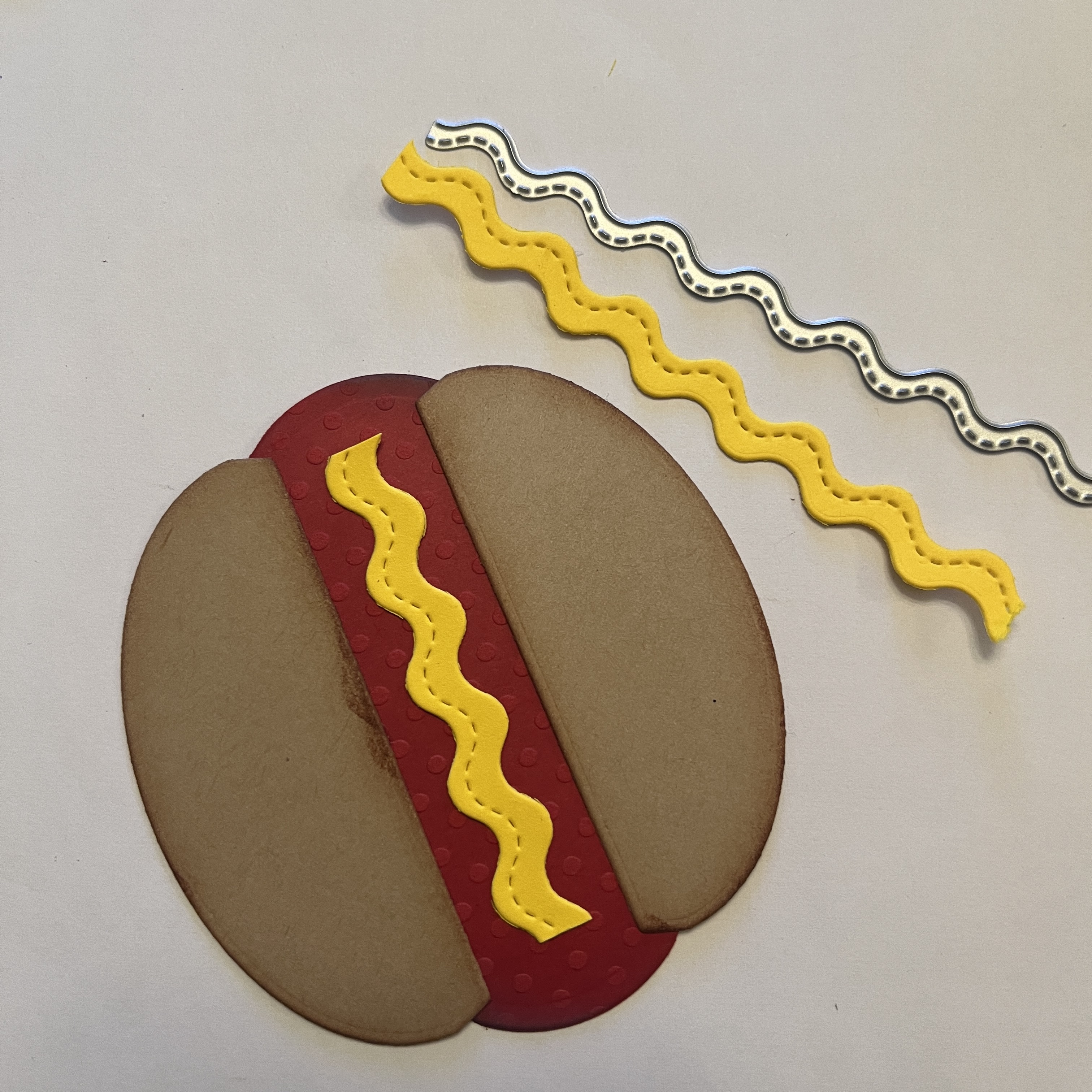 Then, for the pie, I used a die cut from my stash, but used the same die cut to make the buns for the hot dog! I also had fun using a stitched border die for the mustard.