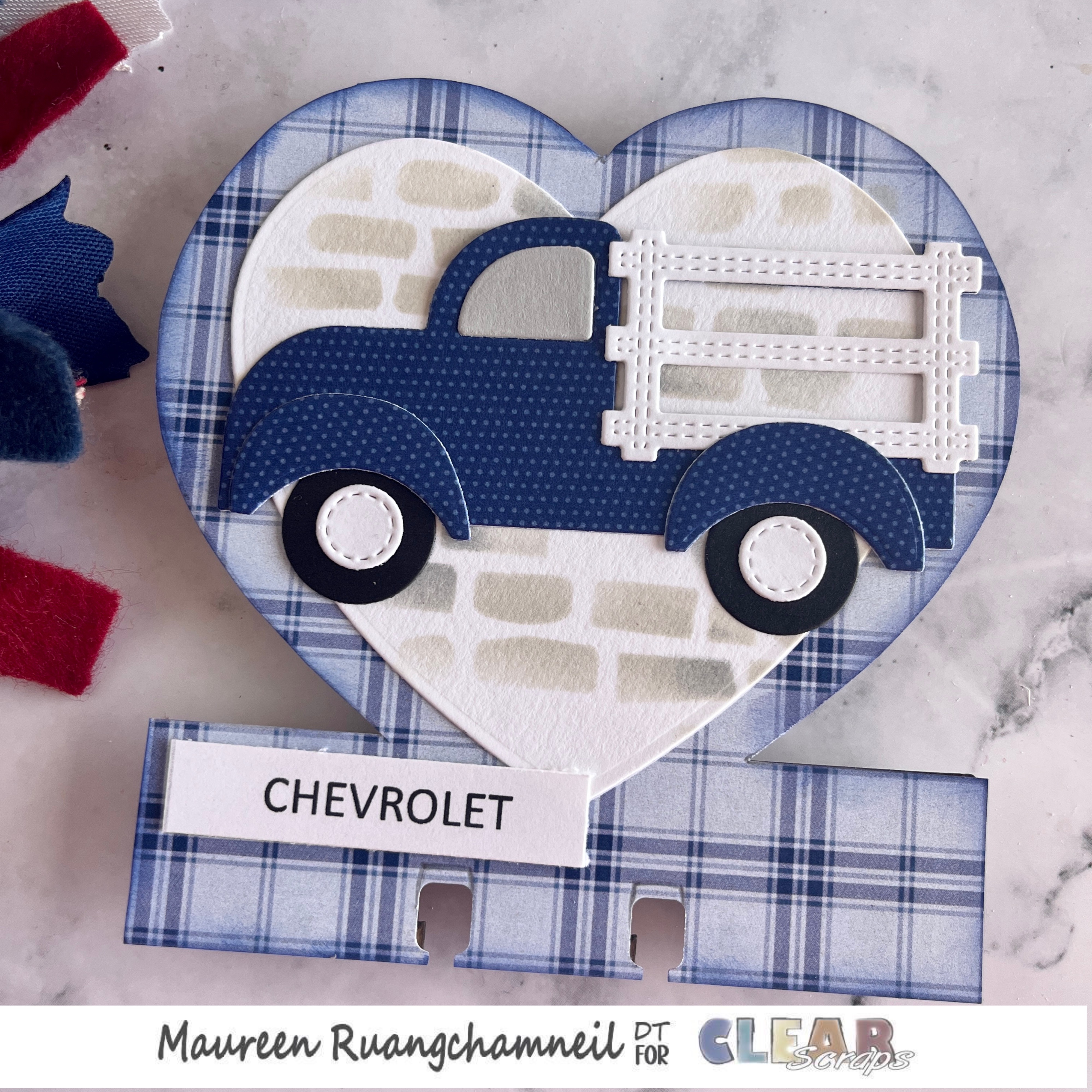 The other heart is covered with a fun blue plaid, and dusted with ink on the edges. I had a truck die set in my stash, so I added this to a white heart backdrop, but it is sponged with a brick background in gray. For this, I'm using the Clear Scraps 4×6 Brick Wall stencil.