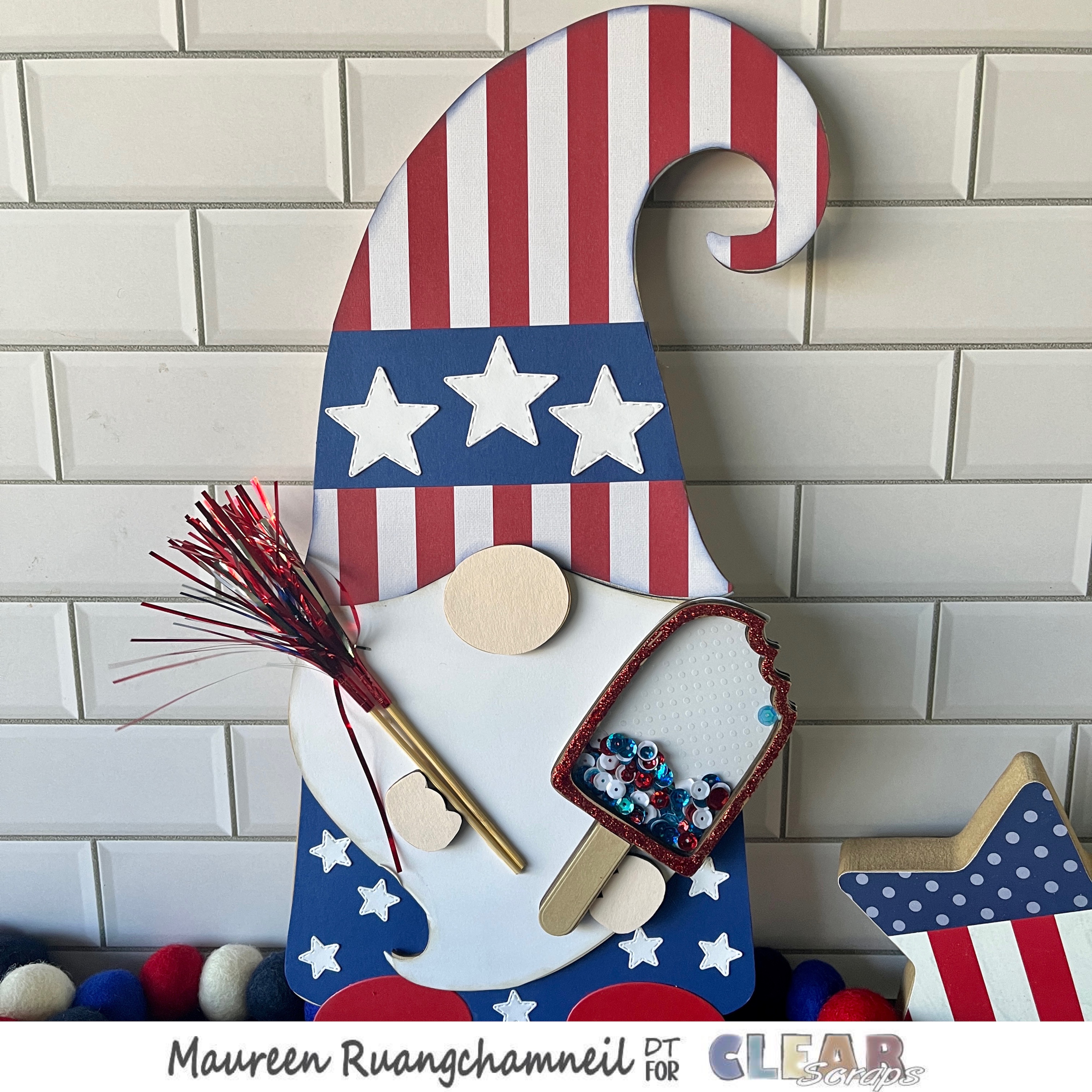 I love these gnomes and I've made several – I'm starting to gather quite a collection! This one is perfect for those Summer events, all decked out in red, white and blue. He is the Medium #1 Gnome Wood Decor but I think I will call him Uncle Sammy. Tee hee!