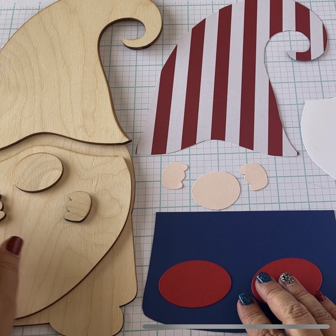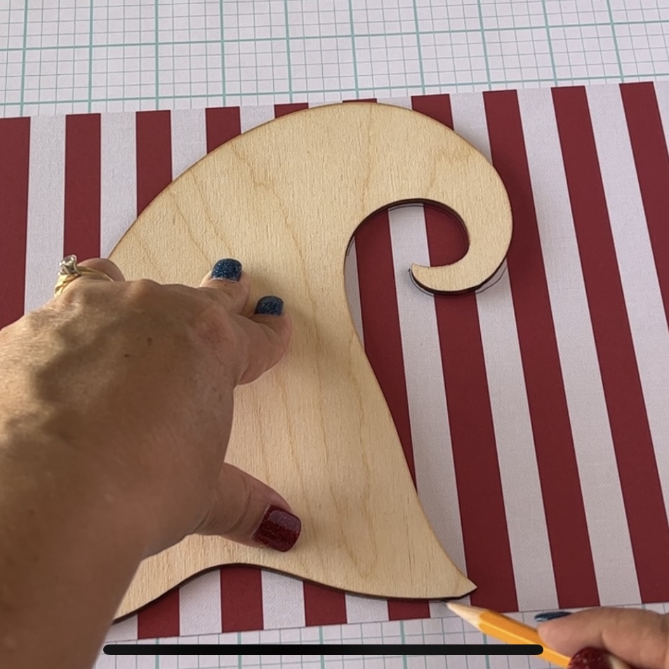 These gnomes are perfect for painting or paper, and this time I chose to cover mine in various patriotic themed papers. I'm starting by tracing all the pieces with a pencil on the coordinating papers: striped for the hat, blue for the pants, white for the beard and peach for the nose and hands.