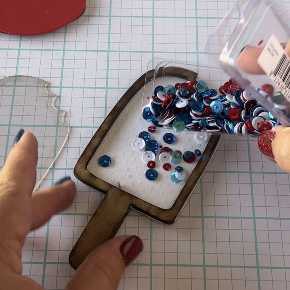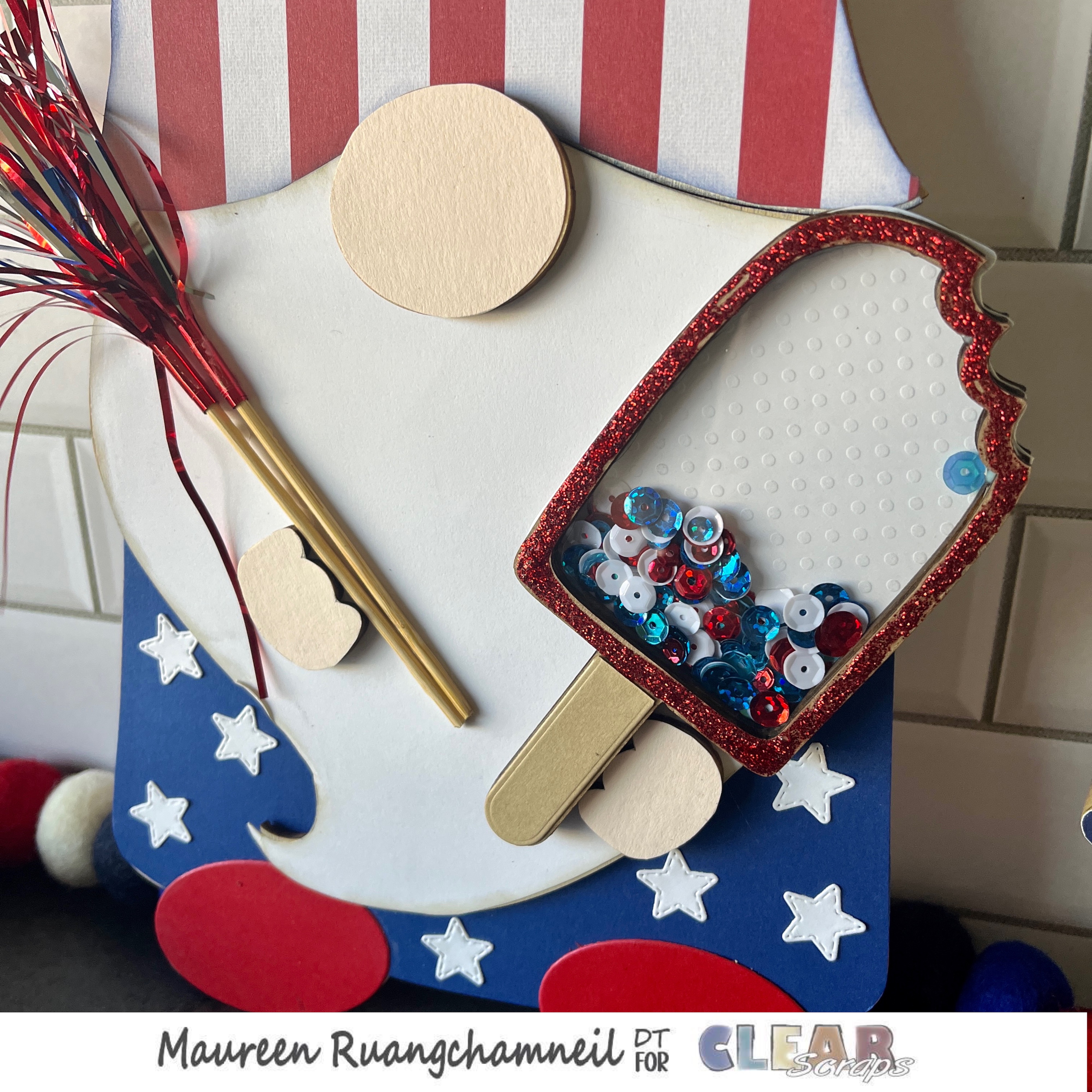 Now it's time to give Uncle Sammy an item to hold – so I've chosen the Popsicle Mini Shaker and the Winter Sequins. To assemble, I glued on white paper to the base chipboard piece, then stacked the 2 bottom layers on top. Next, I filled the item with the sequins and glued on the acrylic cover. Make sure to remove the protective sheet on both sides.