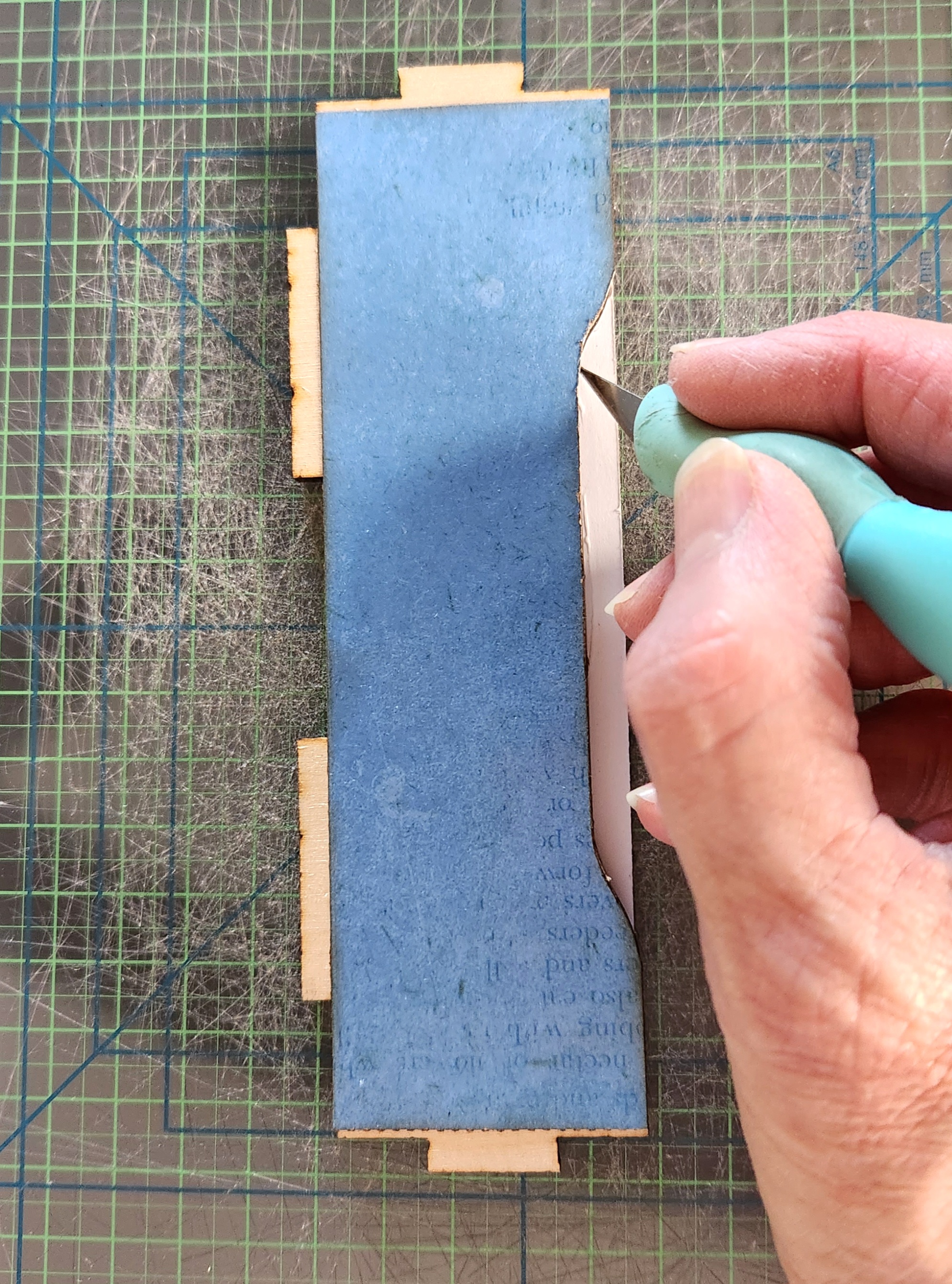To begin remove all your wood box pieces from your package. You can paint, ink, or add patterned papers to your outside and inside of your box. I chose to cover all wood pieces including the inside bottom of my box using patterned papers. Using my xaco knife, I trimmed around my curved edge on both wood side pieces.