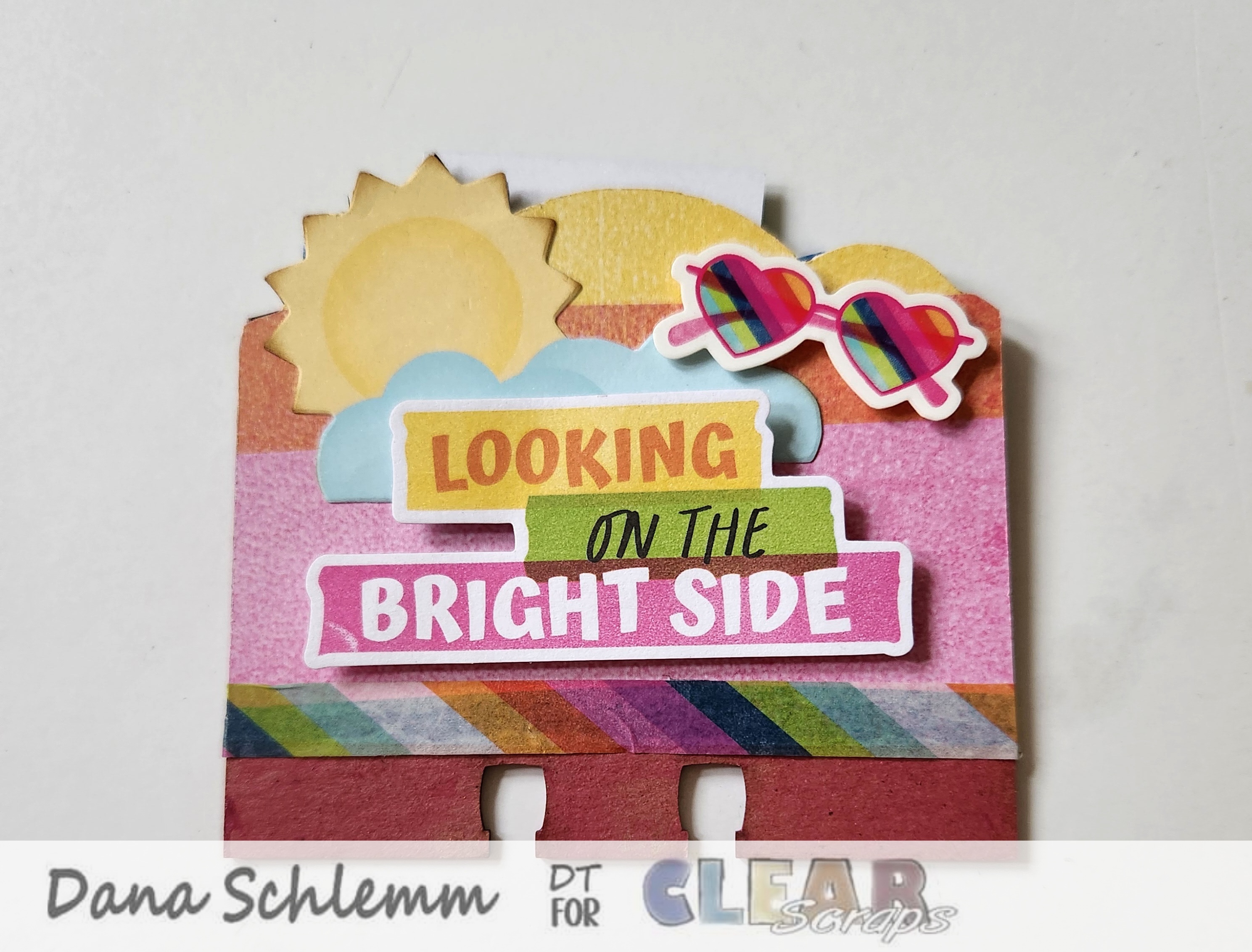 Card 1 Scallop Chip (Front) : I covered the base with colored stripes paper. I cut my papers to measure 4x 2&3/4. Using foam dots, I adhered my sticker sunglasses and sentiment. I added a sunshine ephemera piece behind the clouds. Here's a photo!
