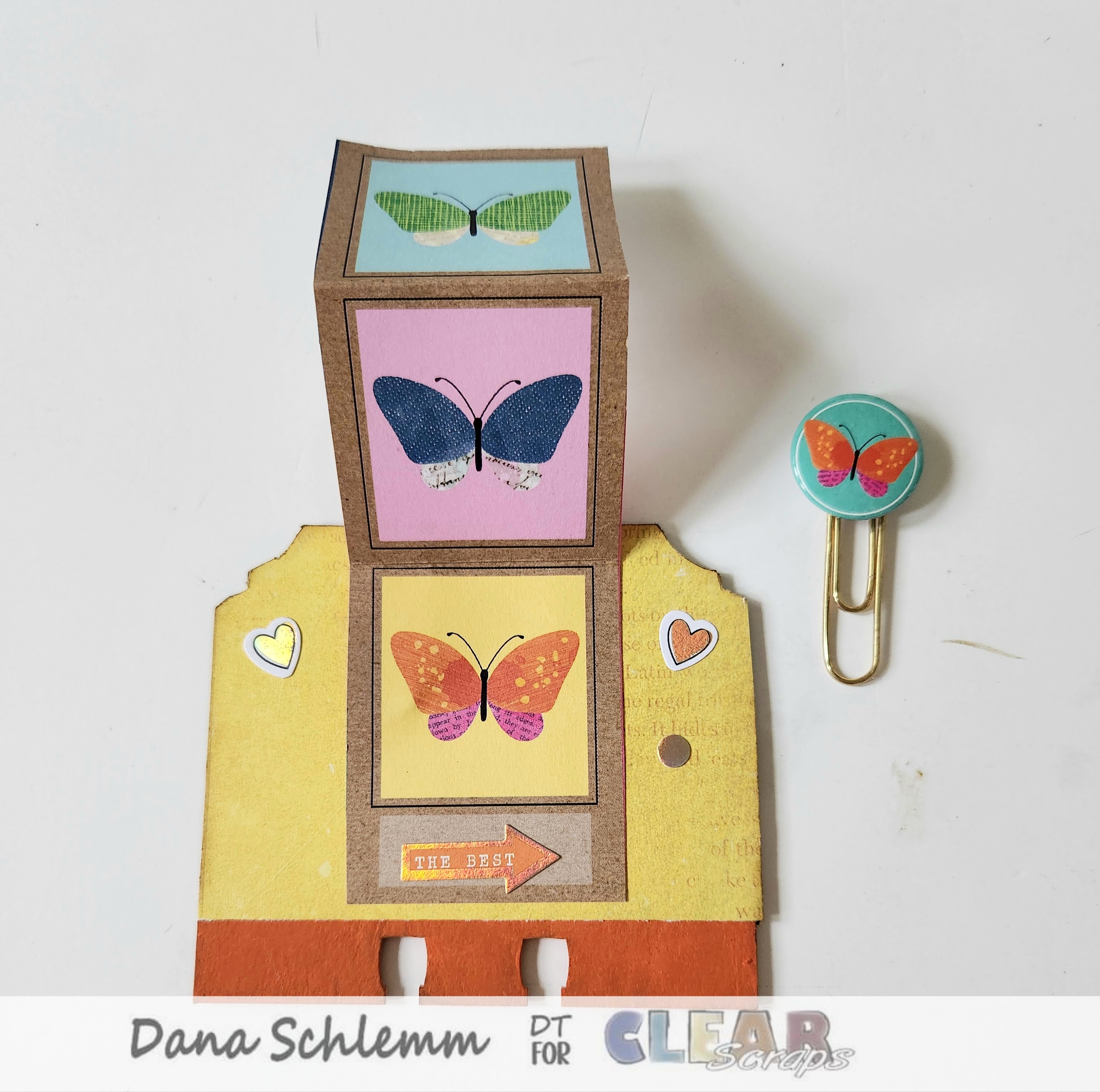 Card 2 Front: I cut out a butterfly Journaling card and scored at 2" and 4", folded on the lines and held it closed with a butterfly paperclip. Glue onto your Divider card base. I added some sticker hearts/dot and sentiment along the bottom edge.