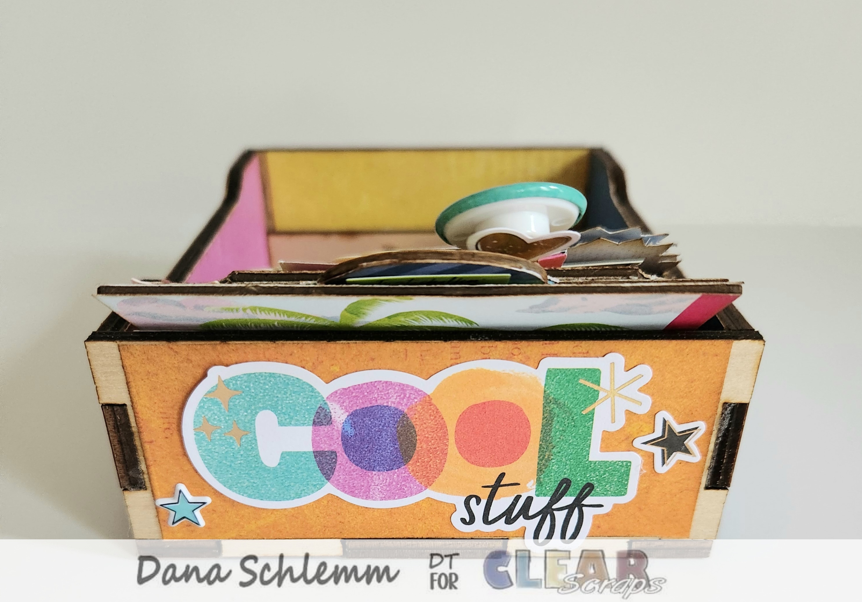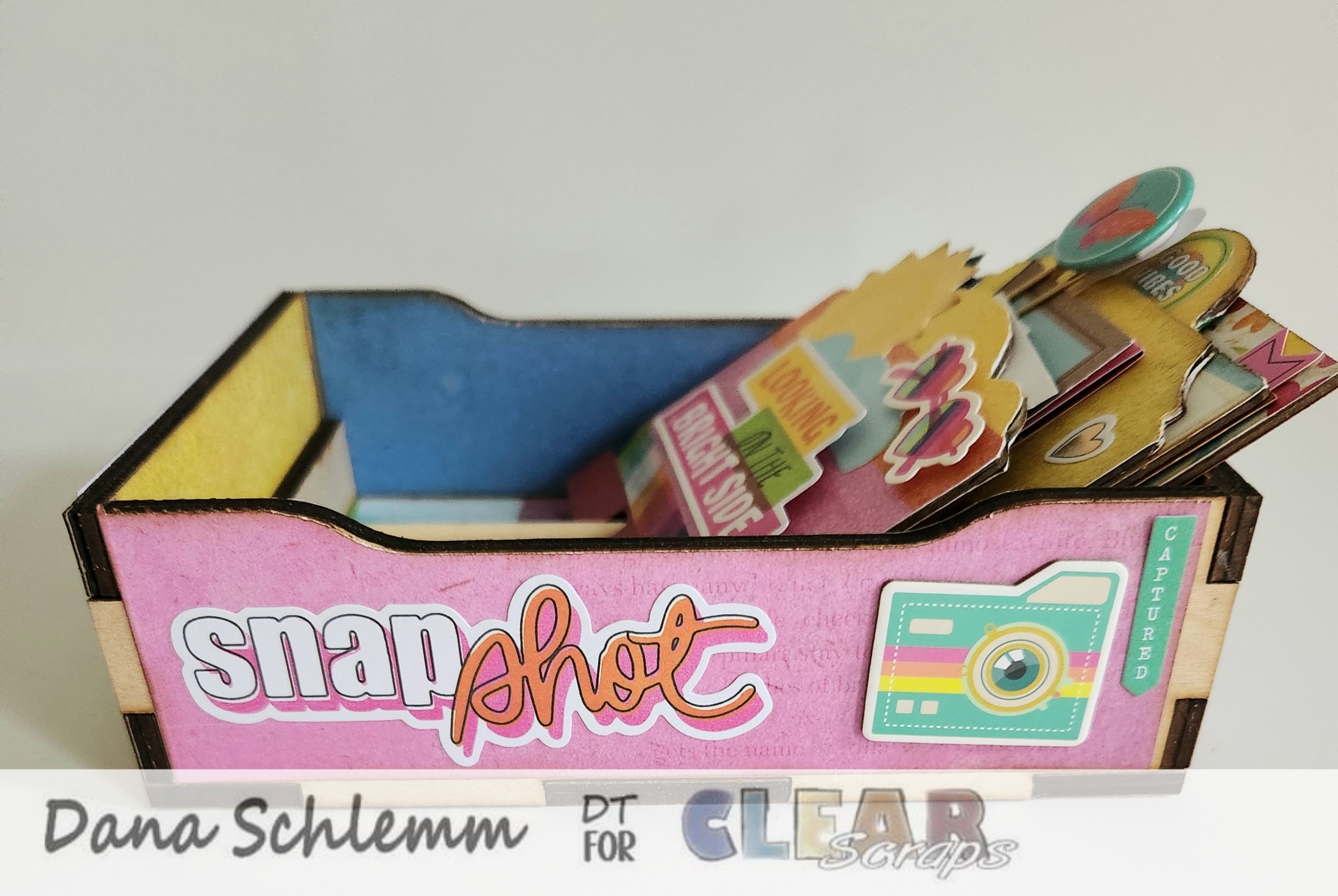 Dana here! I'm back to share my last project for the month of June. Didn't this go by fast? I'm sure many of you, have family vacations planned. These Clear Scraps DIY Wood Boxes and Divider Cards are a great place to store your vacation photos! See all the newest products including the different size boxes and Divider Cards Click here
