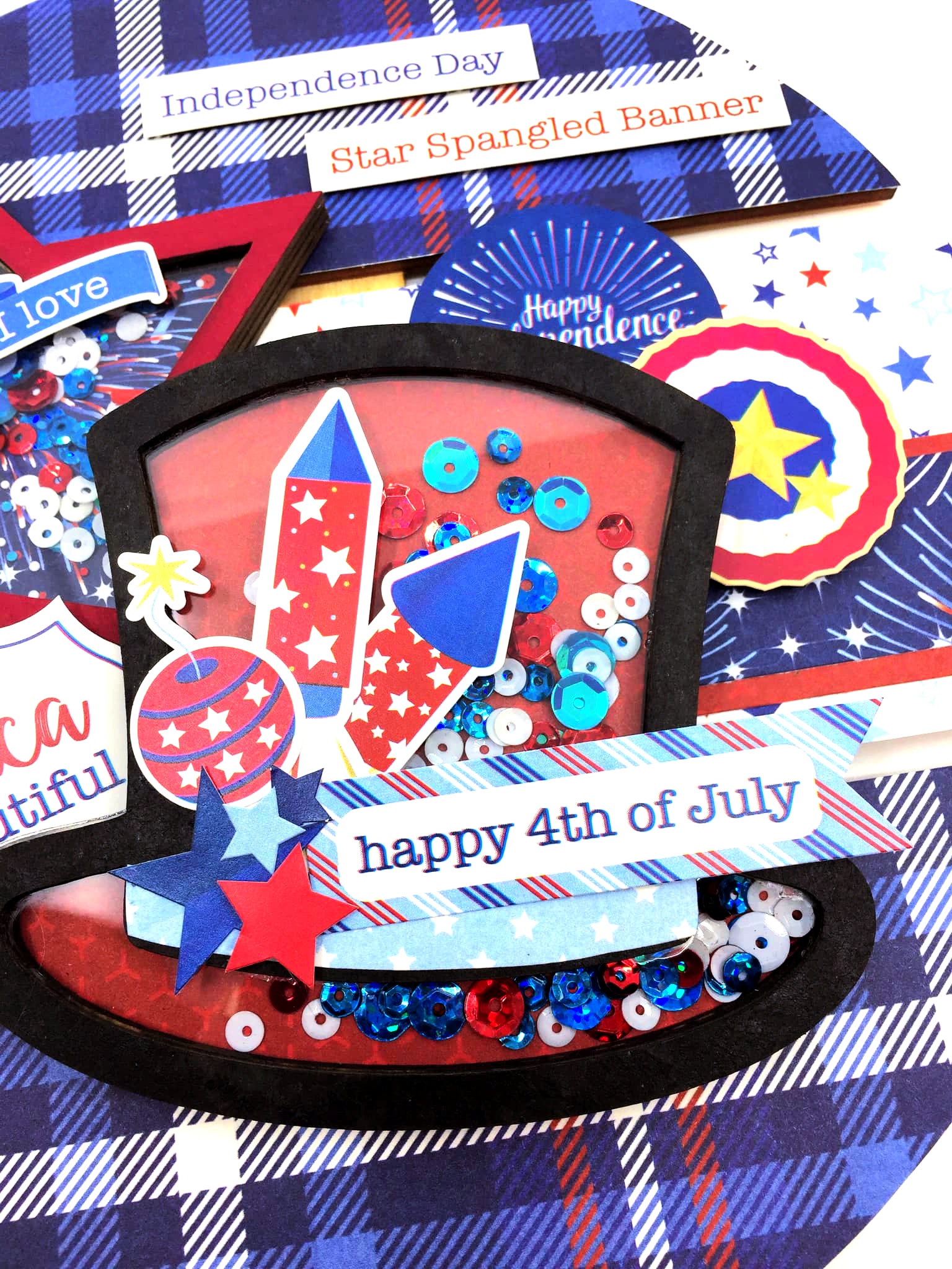 First up is the star embellishment. This was created using the Clear Scraps Mini Shaker Star. The solid back piece is traced onto patterned paper and then cut out and glued onto the back piece. Then the other layers are glued on top. Before the acrylic layer (remember to pull off the protective coating), I added the Clear Scraps Winter Sequin Mix. It's winter, but has the perfect red, white and blue colors for this type of project! After all the layers were glued down, I glued on the star and started the second shaker.