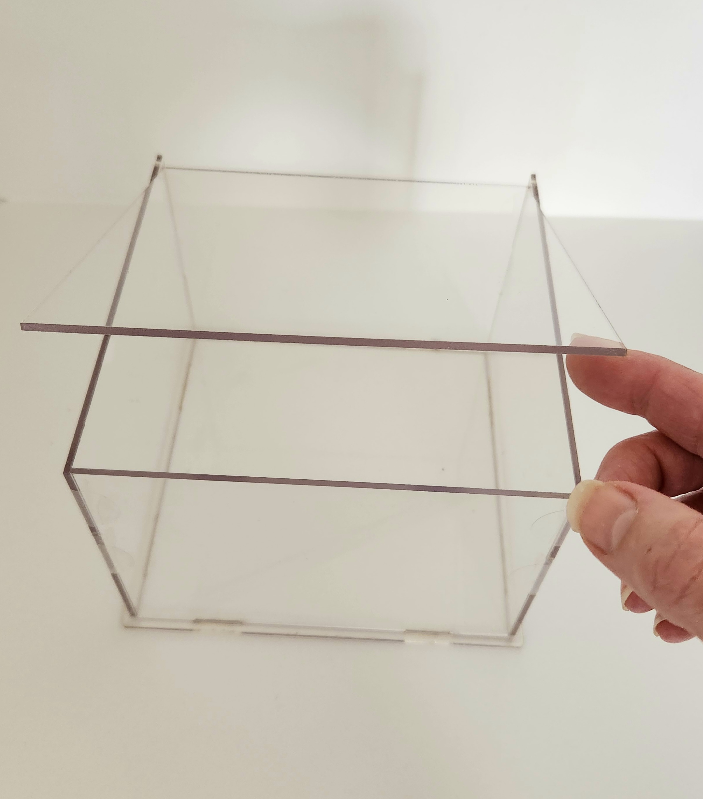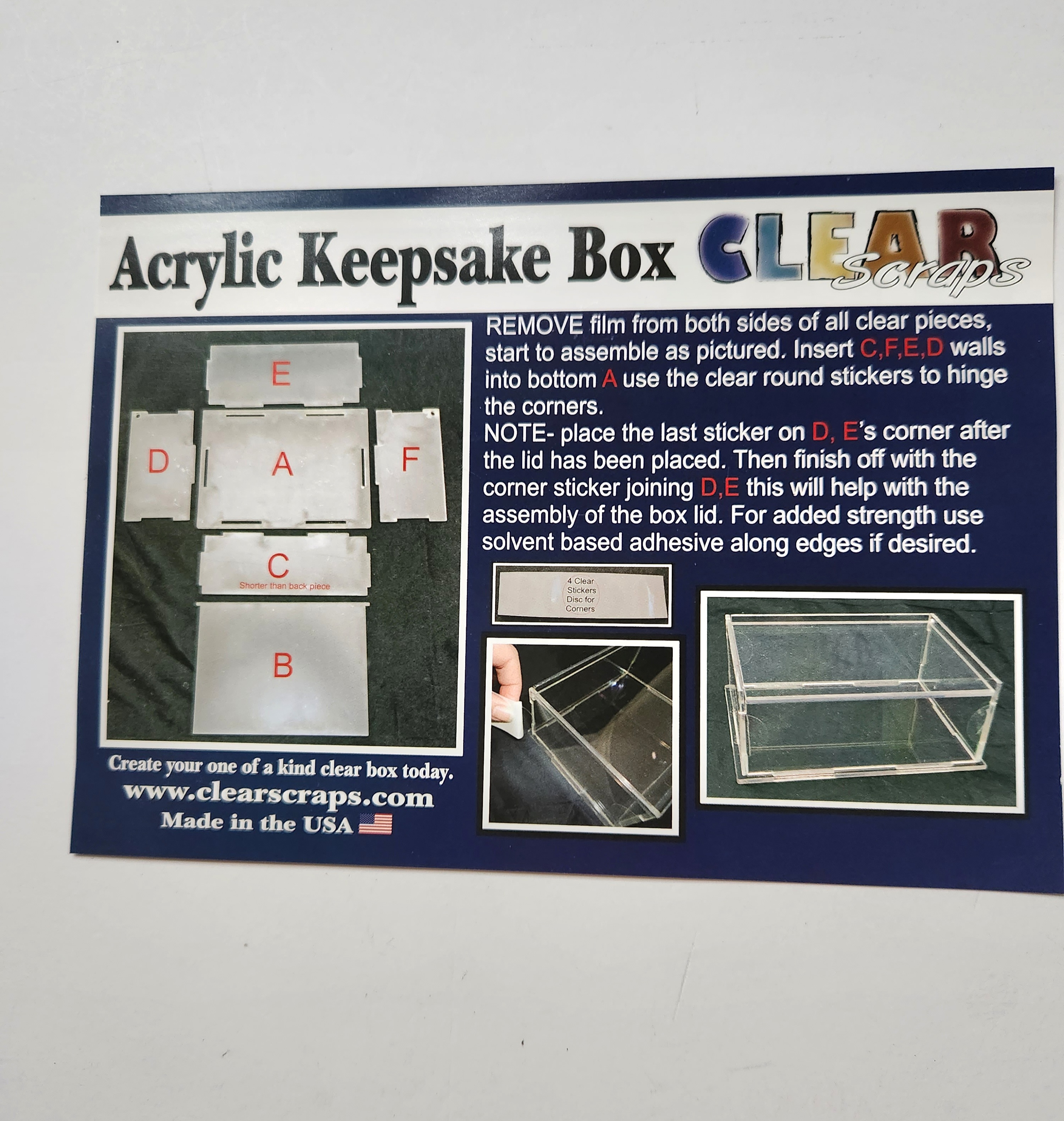 I recommend using a strong permanent glue such as Beacon glue. Included in your package are Clear circle stickers to help hold your pieces together after gluing. I do recommend adding Beacon glue to all the slot edges this helps the acrylic to bond and stay in place. After your box is assembled and throughly dry, remove all circle stickers from the corners of your acrylic box. Here's how it should look: