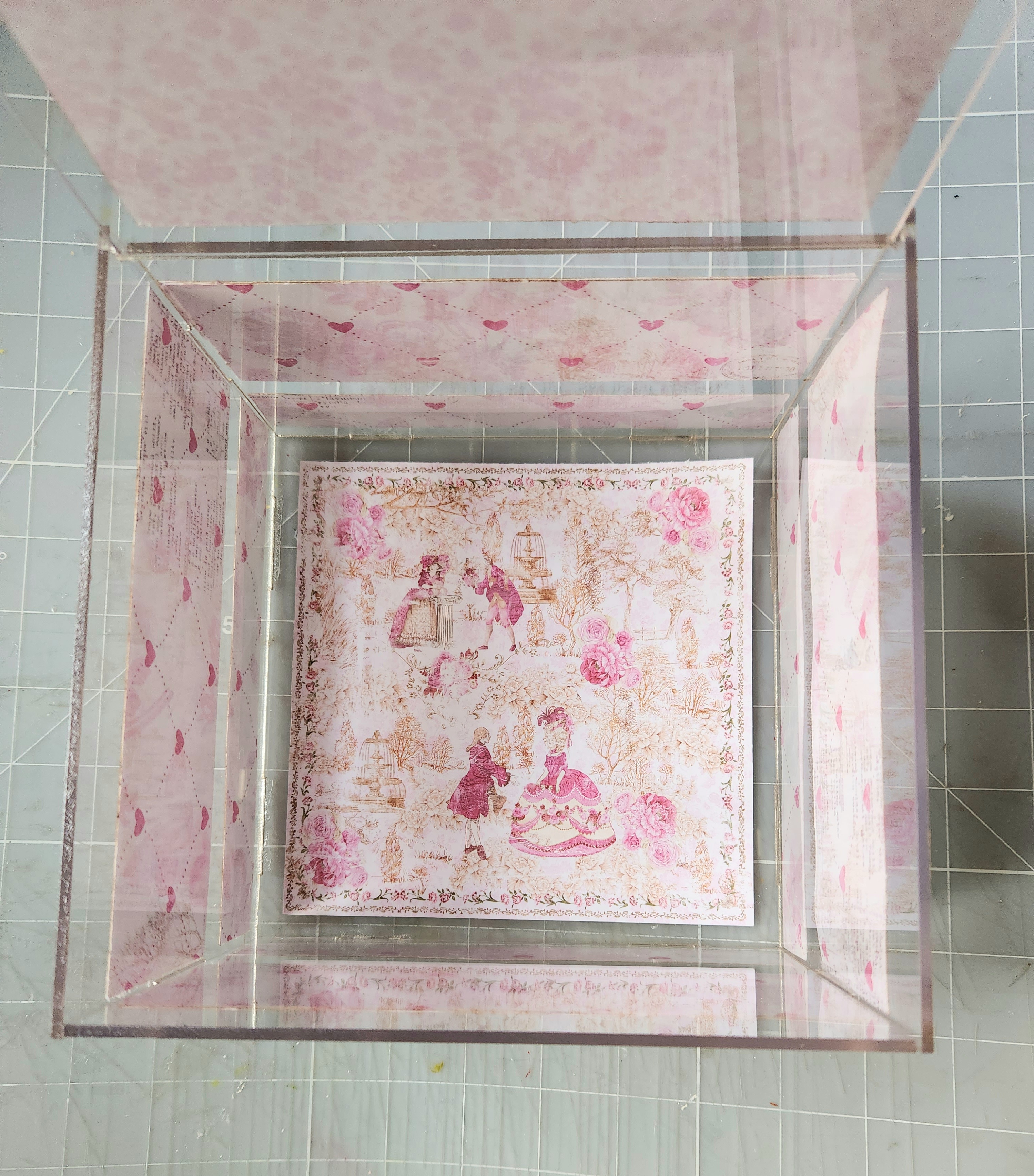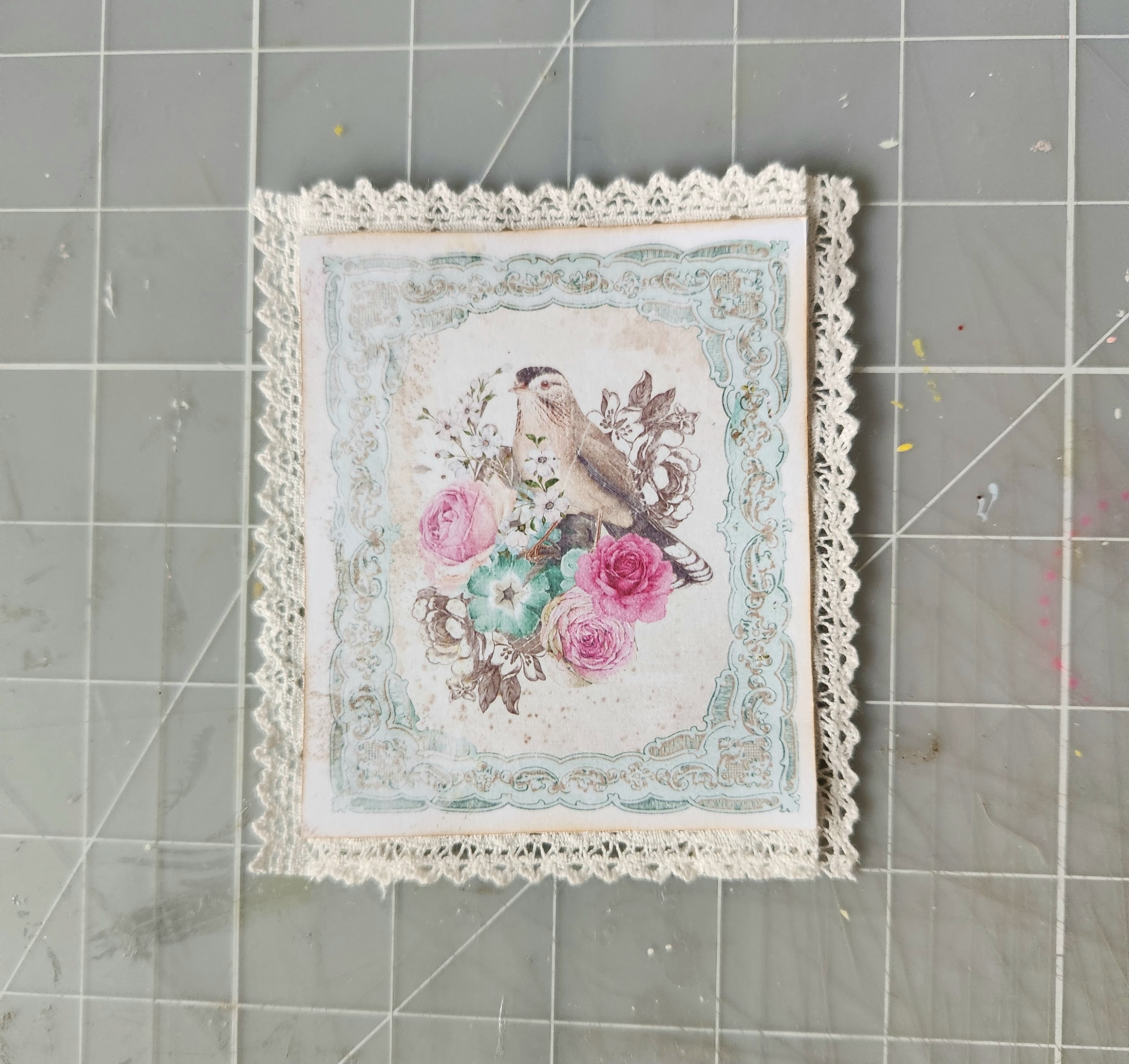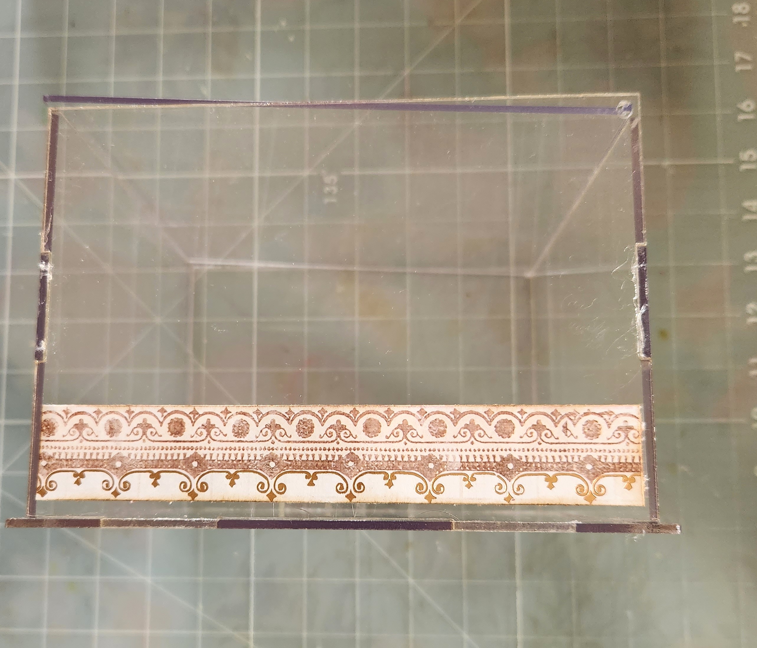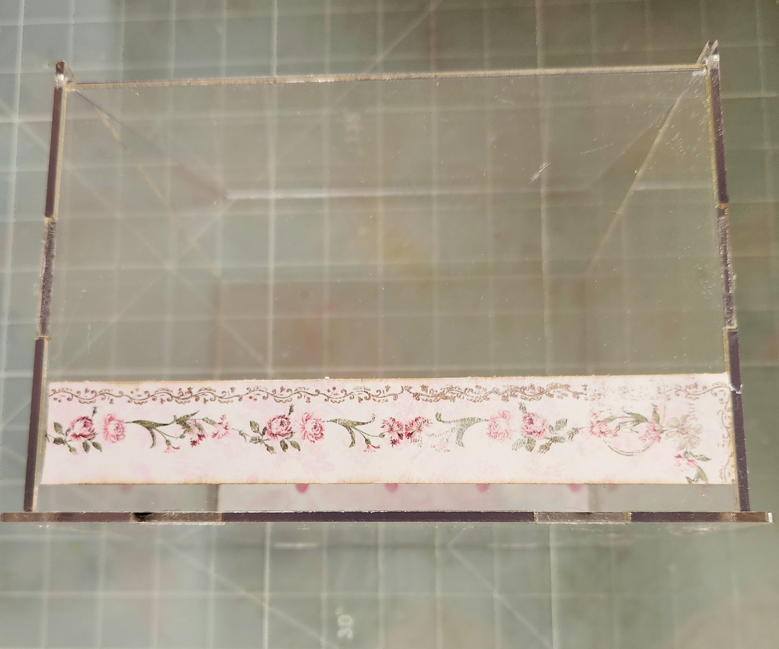 Now we can begin to decorate the top of our acrylic box! I cut out one of the Journaling cards from this paper collection. I glued some vintage trim along the outside of my journal card. Here's a photo:
