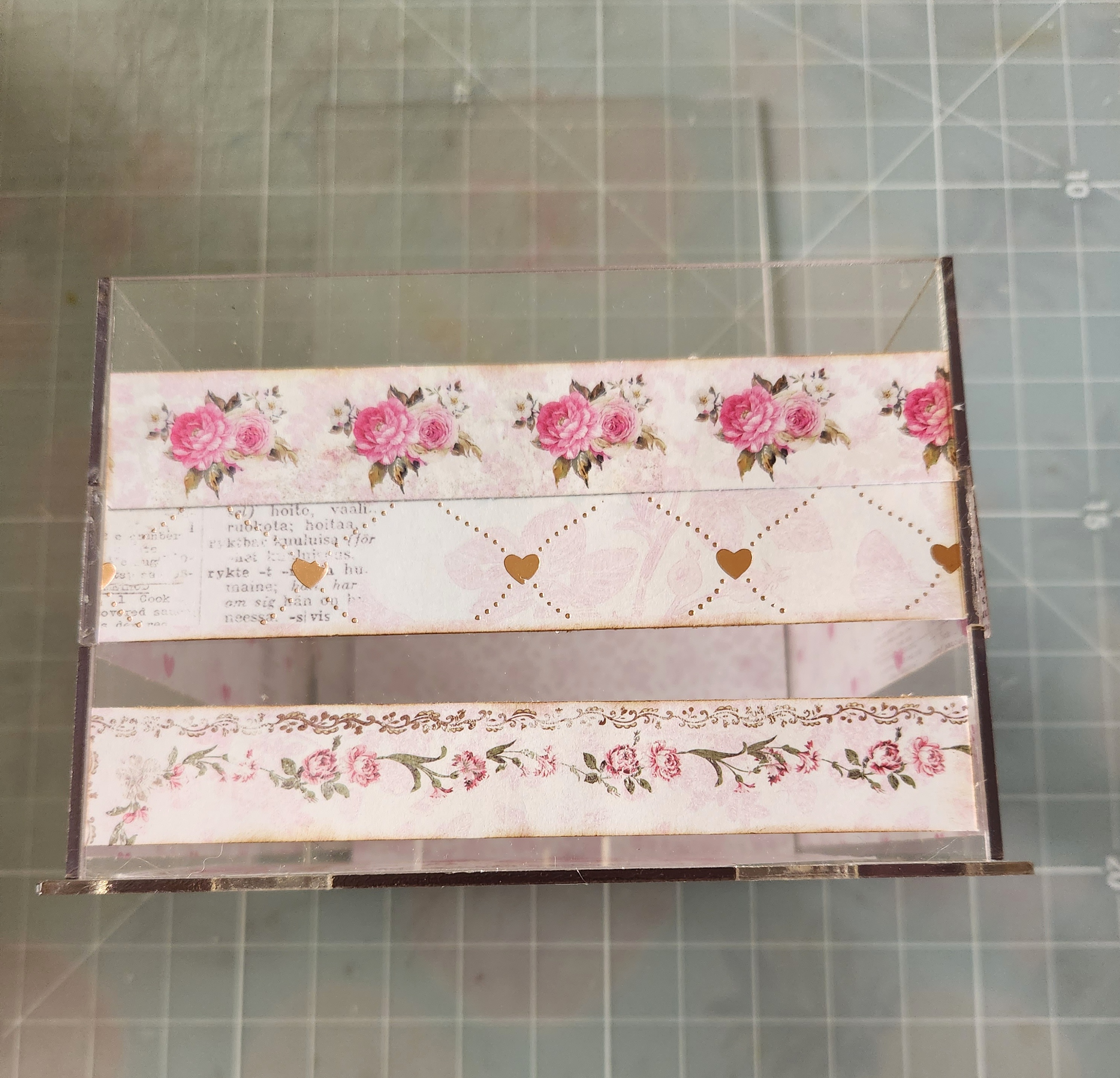 Now taking 2 different coordinating papers, I cut one 12" border strip to measure 6 & 1/2 inches x 1 inch and the top border strip measures 6 & 1/2 x 2 & 1/8 inches. I adhered them along all four outside edges, leaving about 1/4 to 1/2 " of the acrylic visible. Make sure that your hearts on the inside are all going in the same direction and right side up, before adhering. I use a clear tape runner or Clear glue when working with acrylic. Be careful where you place your tape or glue and dont use too much. Here's some closeup photos!