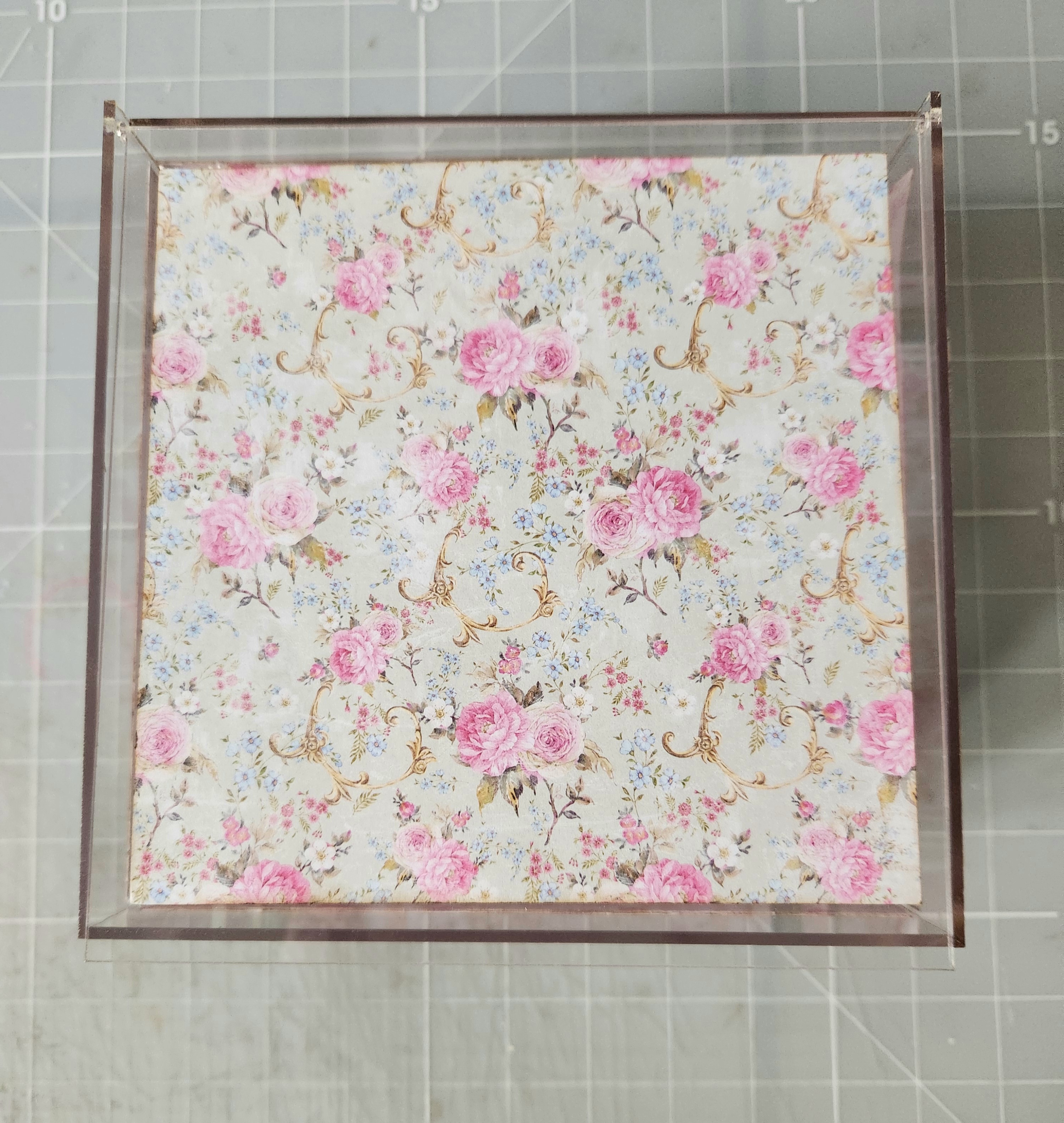 On the top of my box I adhered one 6×6 floral paper. Remember whatever paper you chose it matches the inside. I glued another coordinating 6×6 paper on the inside bottom of my box. Here's acouple photos!