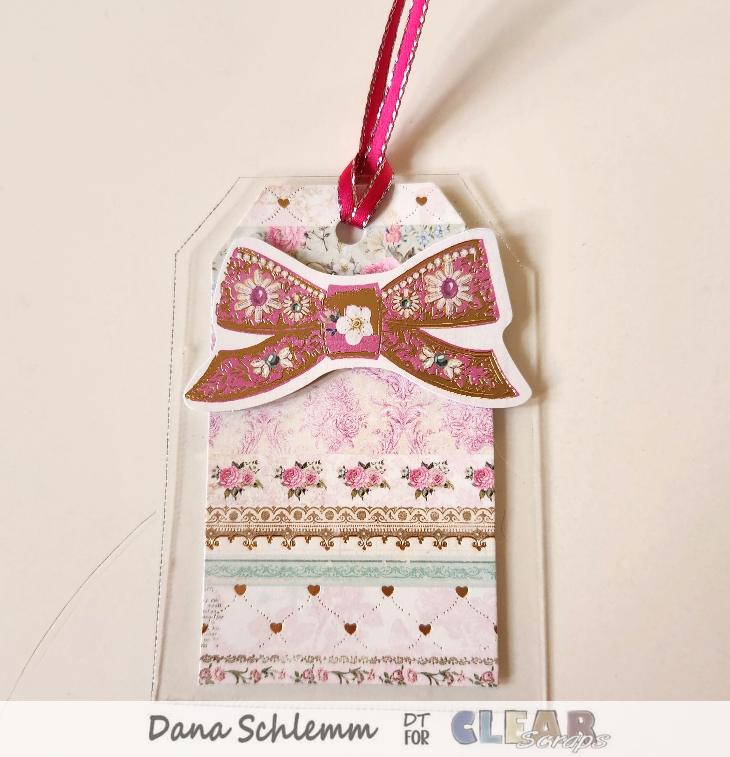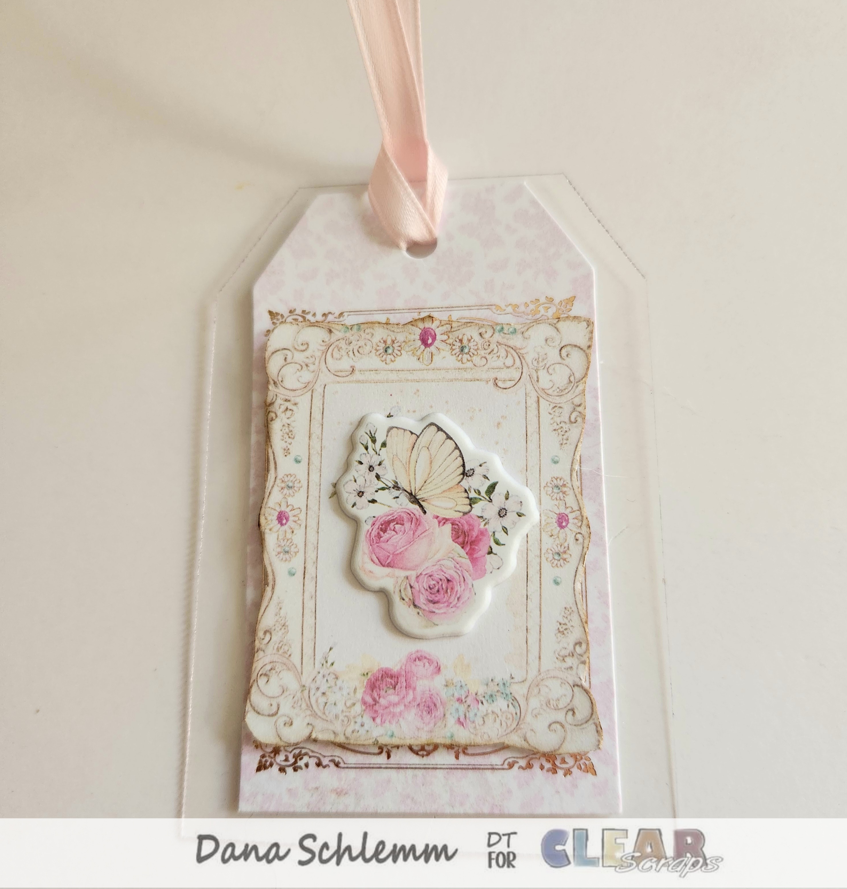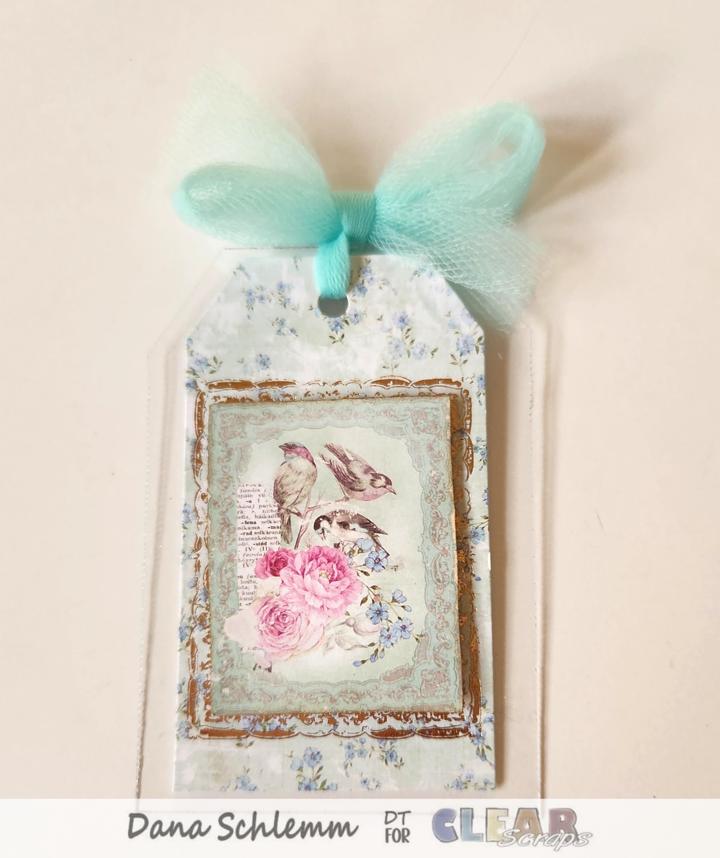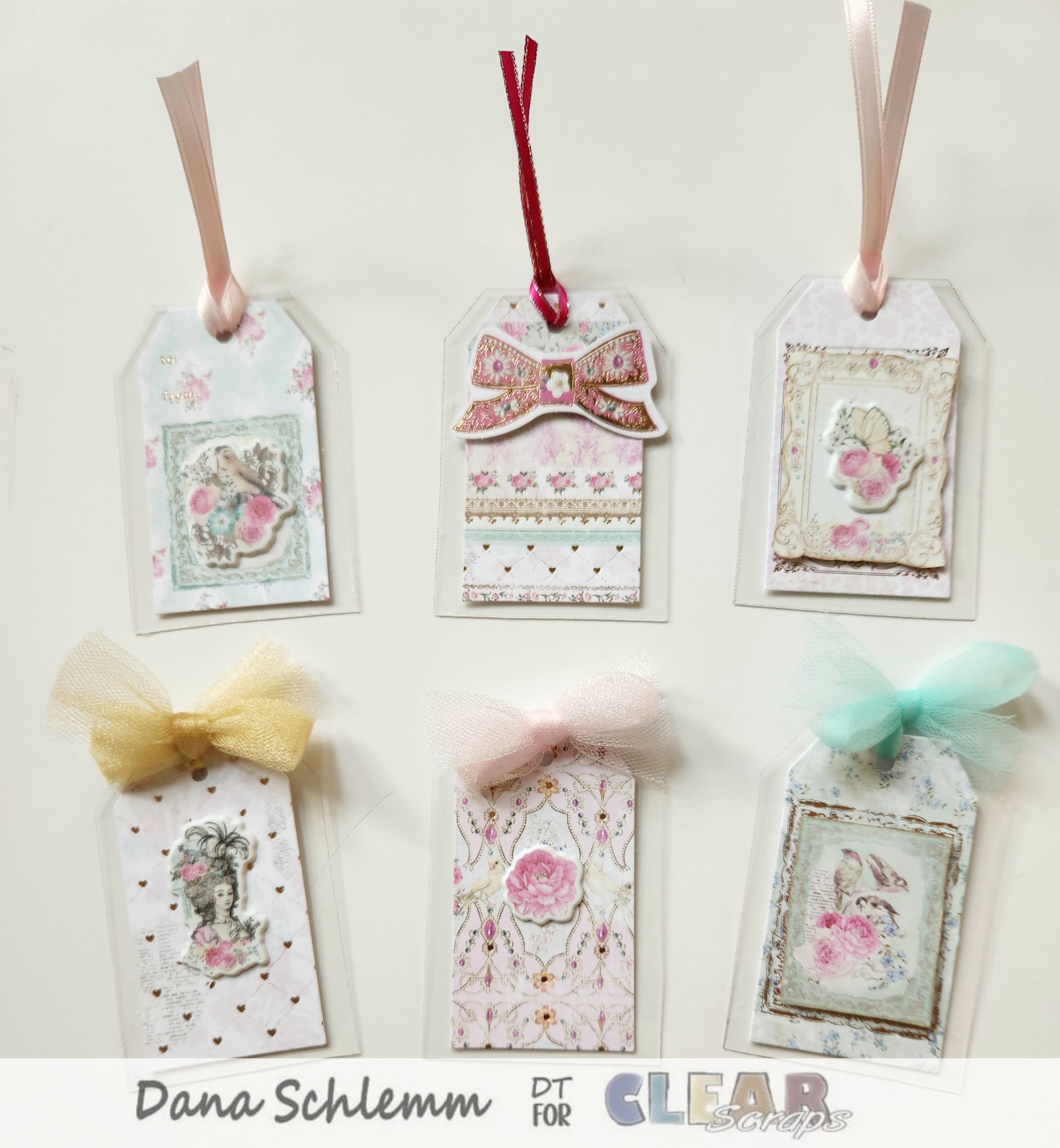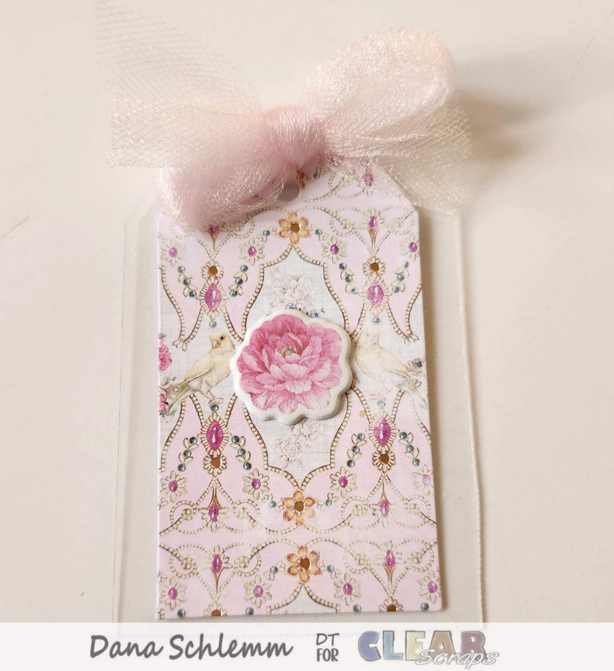 I took 6 smaller tags from my Prima Tags and Tickets package and adhered to the center of each acrylic tag. I cut one small journal card, some chipboard stickers and puffy stickers and glued on the front of each tag as an embellishment. To finish, I tied some pink ribbon and various colors of tulle through each hole and tied in a bow! Here's a photo: