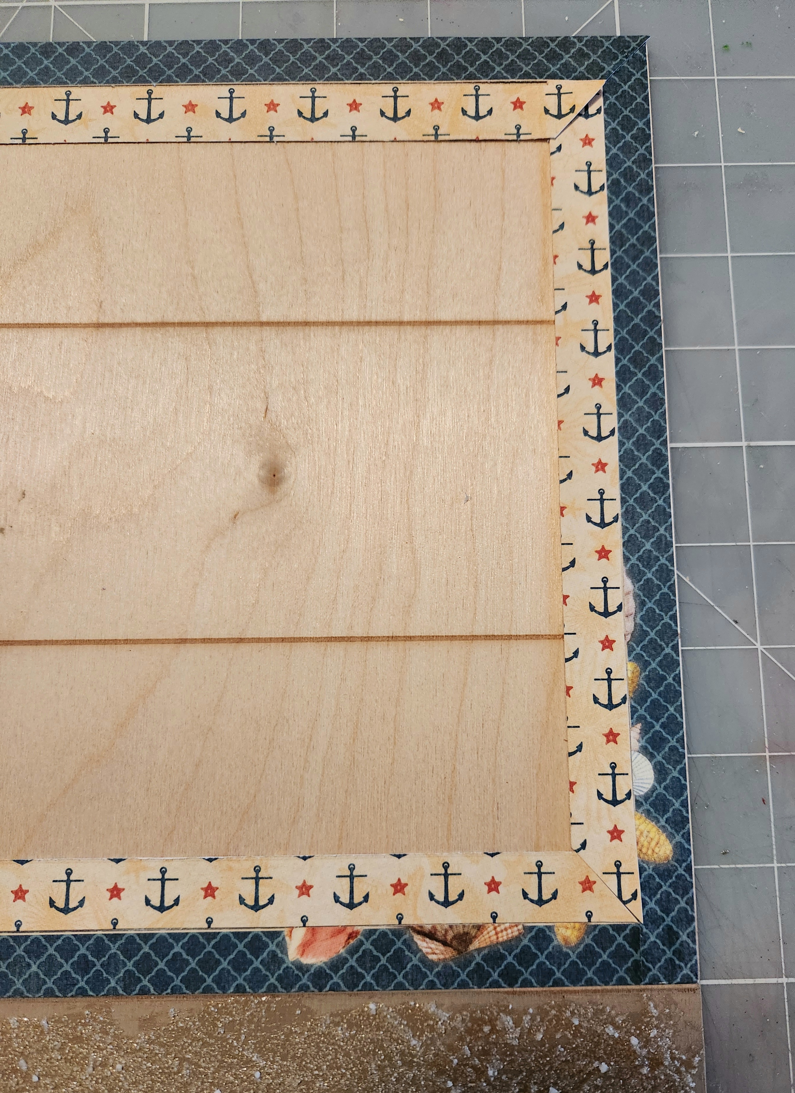Next from the 12×12 paper "By the Sea" I cut 2 paper strips to measure: 1/2 " x 9 & 3/8. Then I also cut 2 more paper strip measuring 1/2" x 11 &1/2 inches. Be mindful when cutting your strips from this paper since we will be using the center piece for our project. I glued my strips along the top, bottom and sides. Here's a photo!
