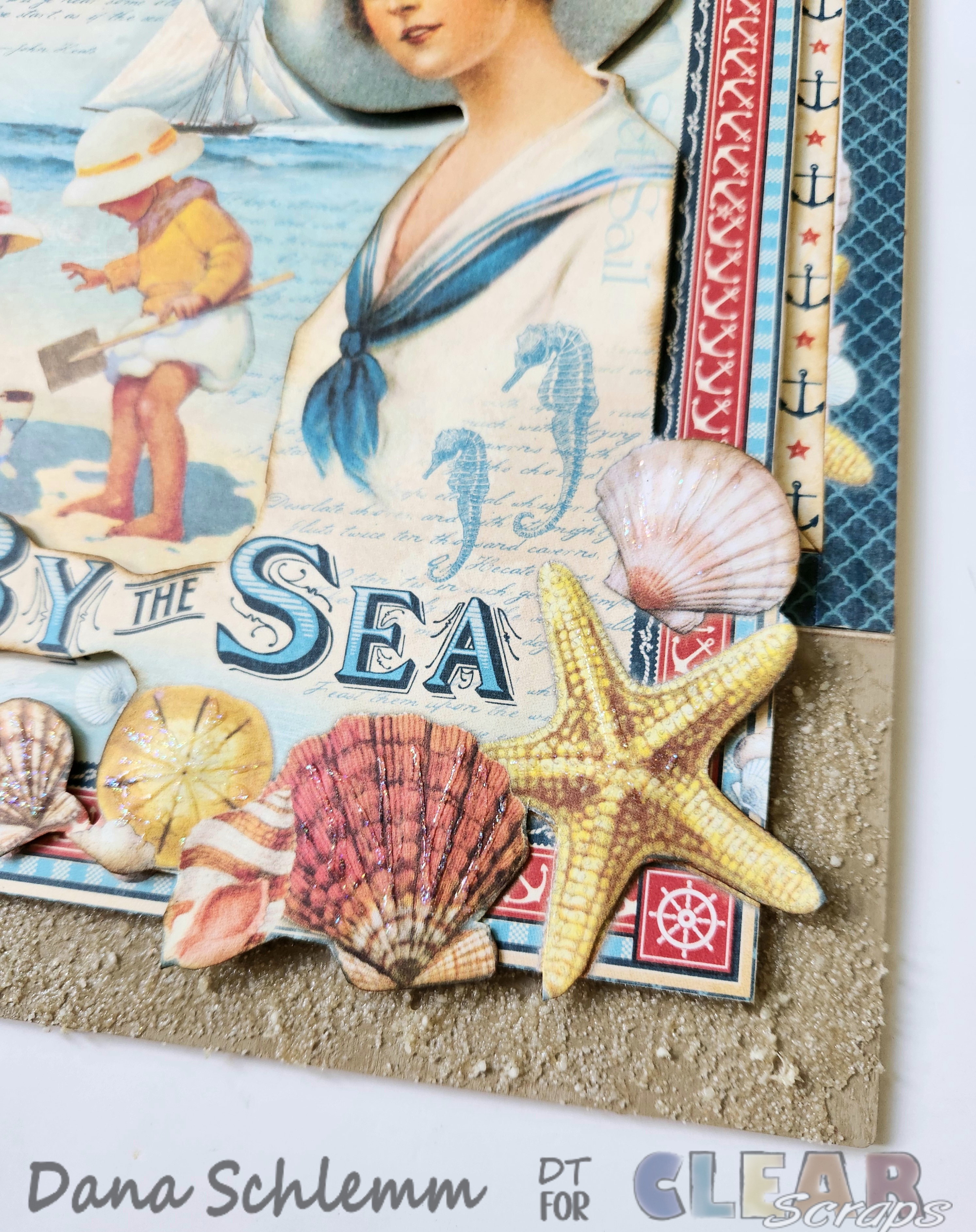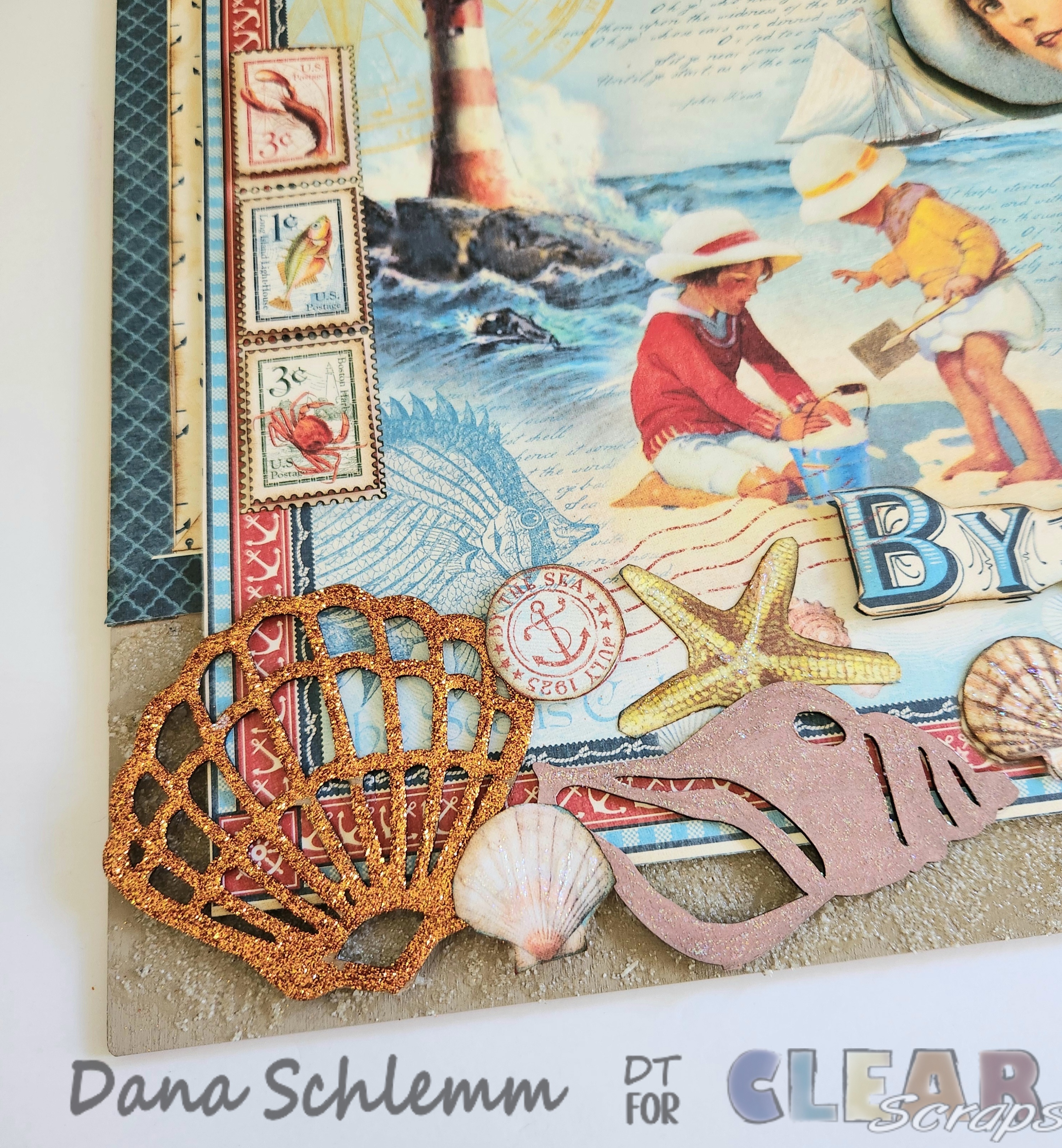 While those pieces are drying, I fussycut out some images from various scrap papers. I applied alittle Stickles Stardust glitter on my Conch Shell chipboard embellishment. Here's a photo: