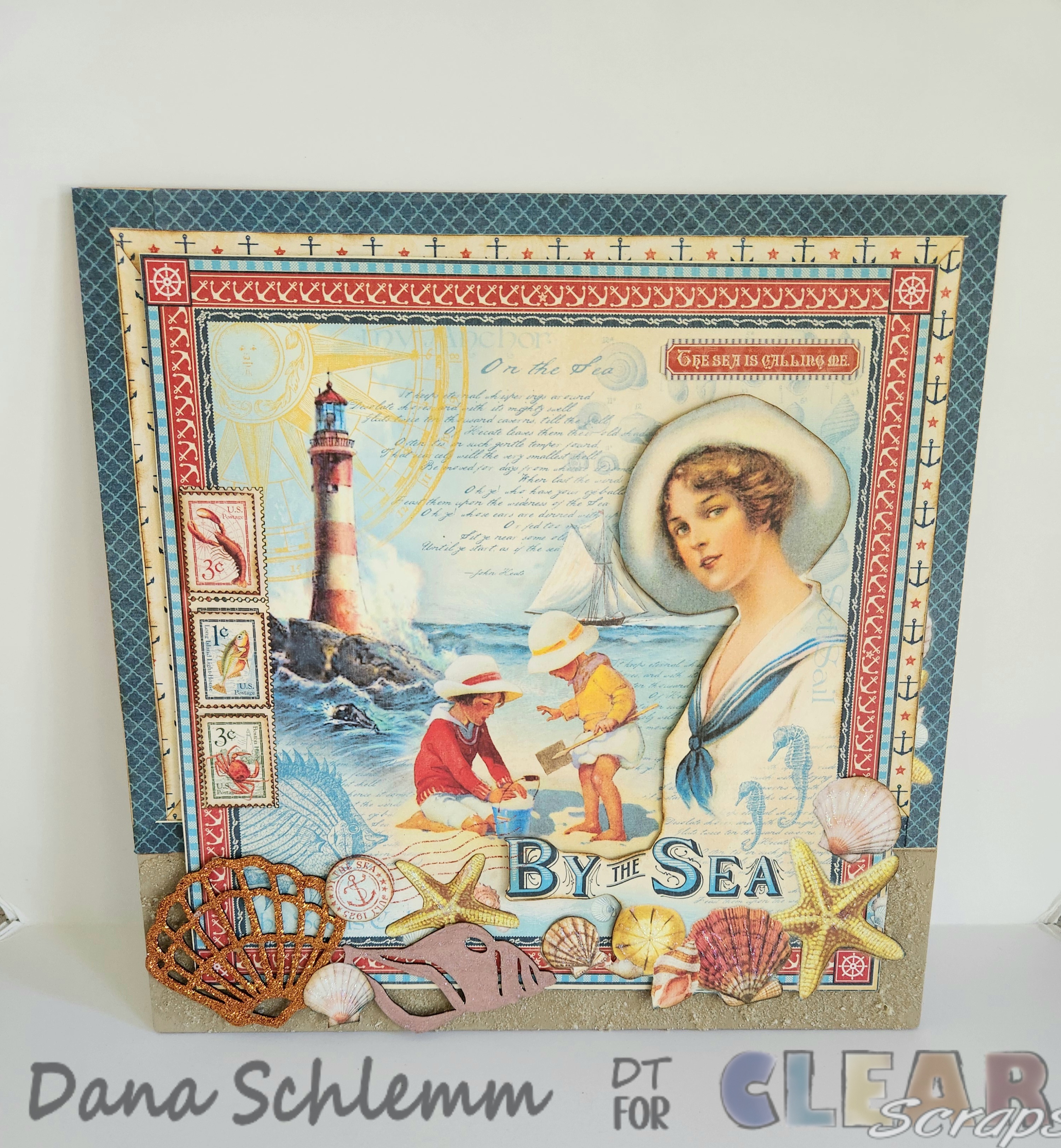 I then arranged my Chipboard Fan Shells Embellishments, and fussycut elements along the bottom of my Shiplap shape. Then glue in place using Beacon glue. I added a sentiment sticker on the upper right corner. Here's some closeups!